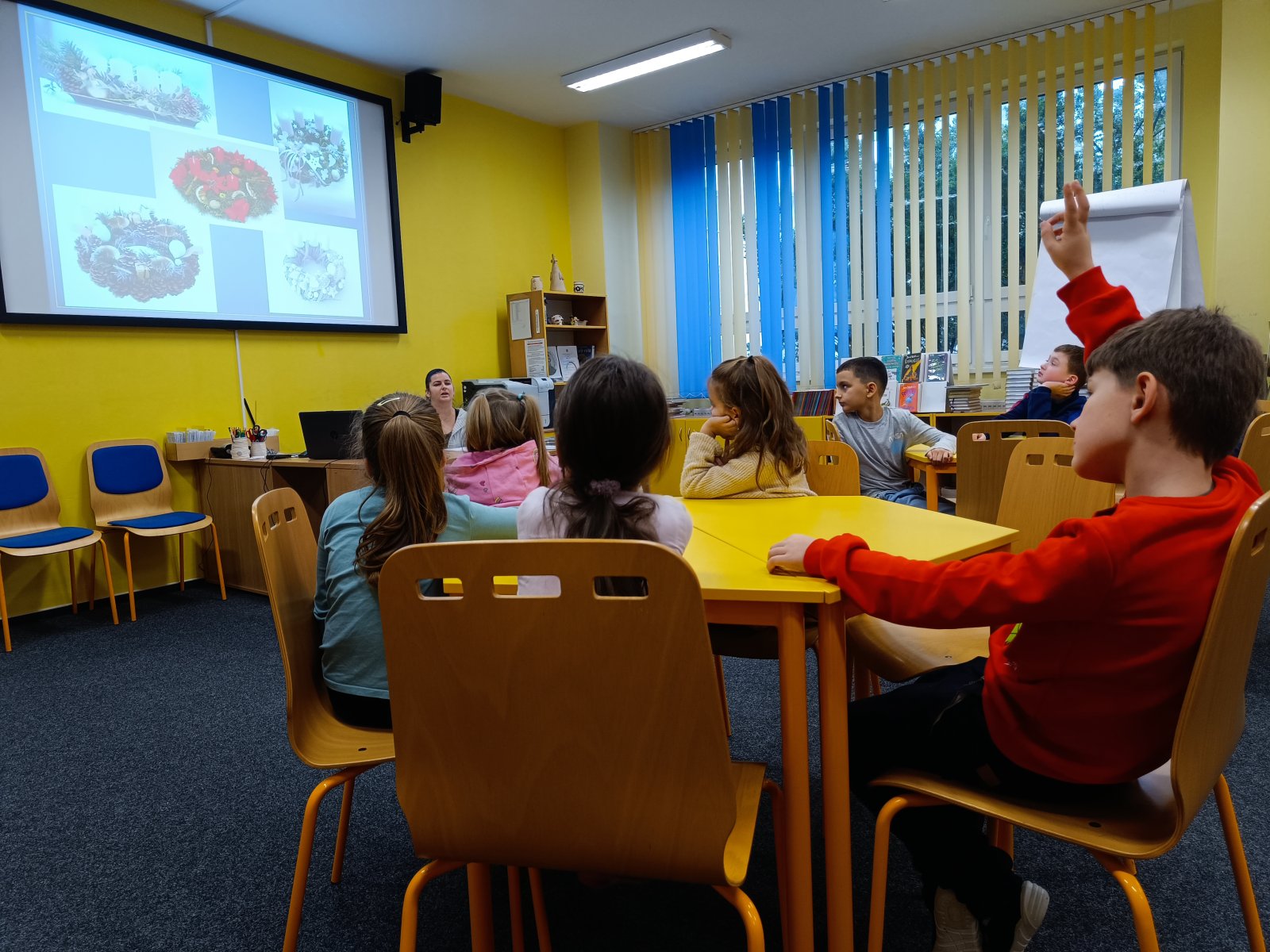 Žáci prvních tříd se 18. prosince zúčastnili adventního programu v naší knihovně. Paní knihovnice jim poutavým vyprávěním přiblížila význam adventního období a jednotlivých vánočních symbolů. Děti se dozvěděly, co symbolizuje adventní věnec, vánoční stromeček, betlém i ryba.