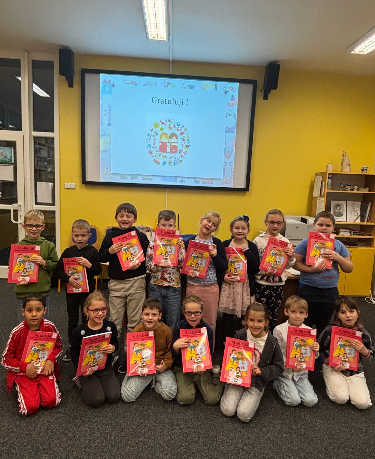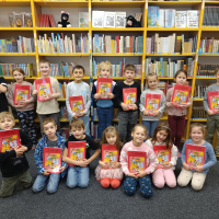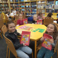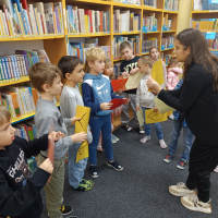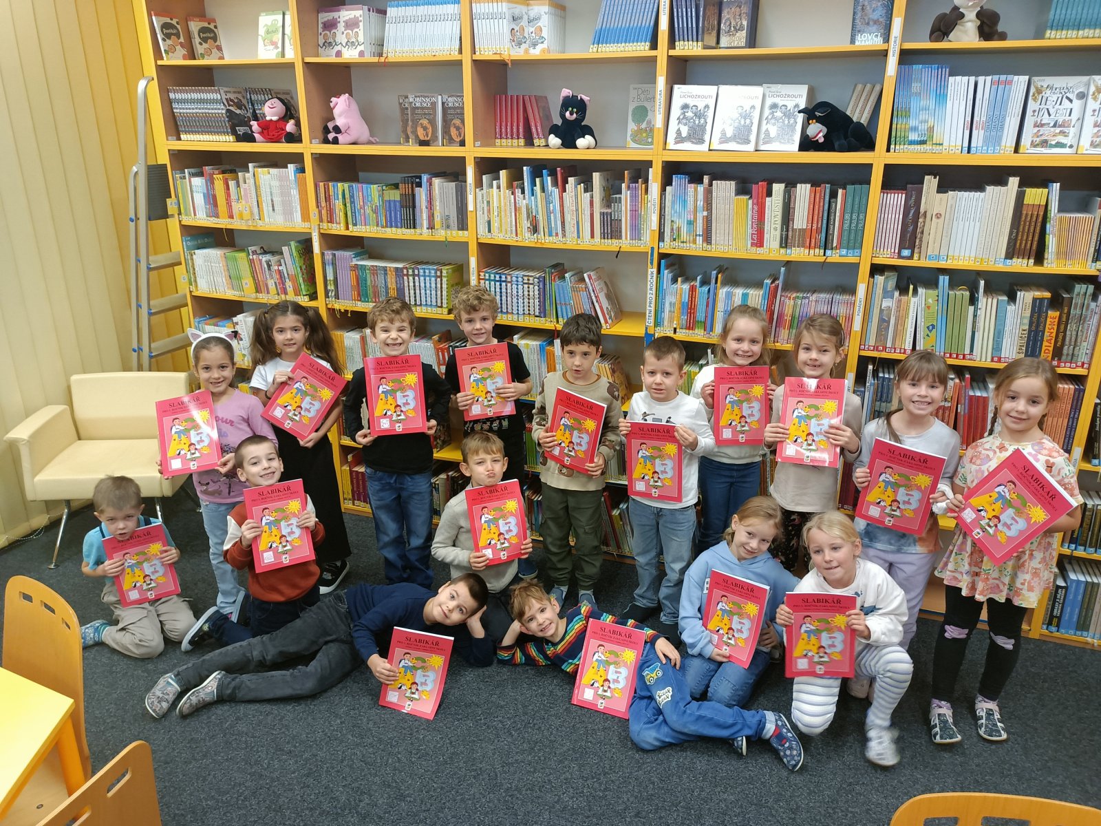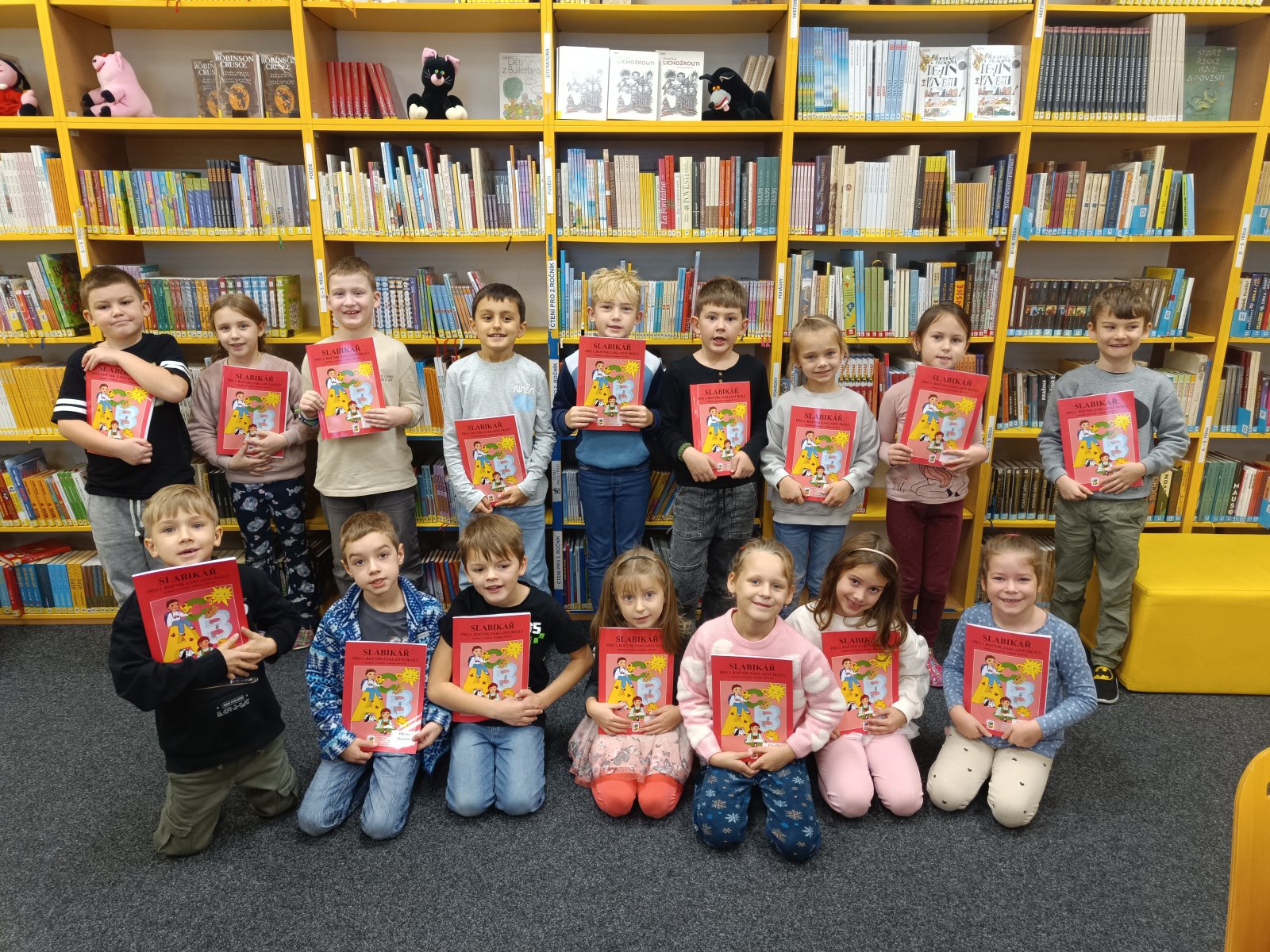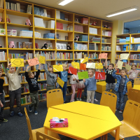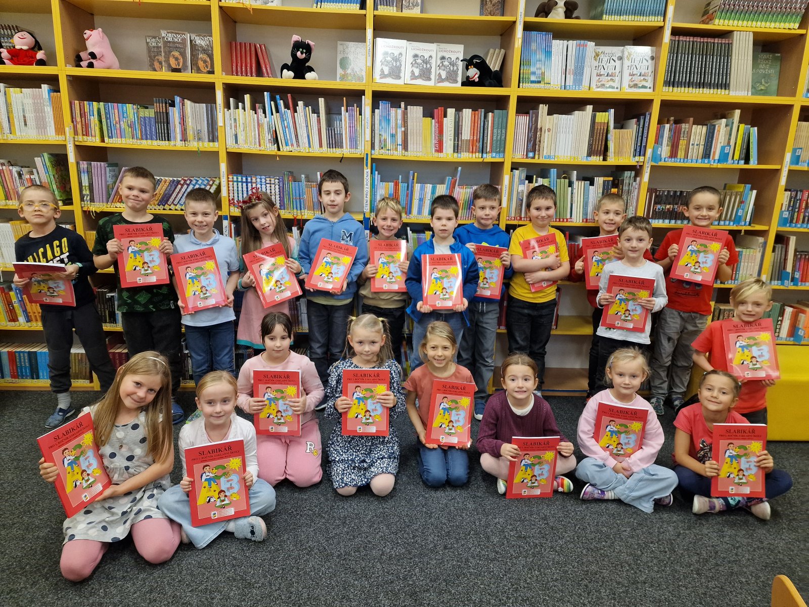 Prvňáčci se vydali na návštěvu do školní knihovny, kde na ně čekalo velké překvapení. Paní knihovnice pro ně měla nachystané Slabikáře.