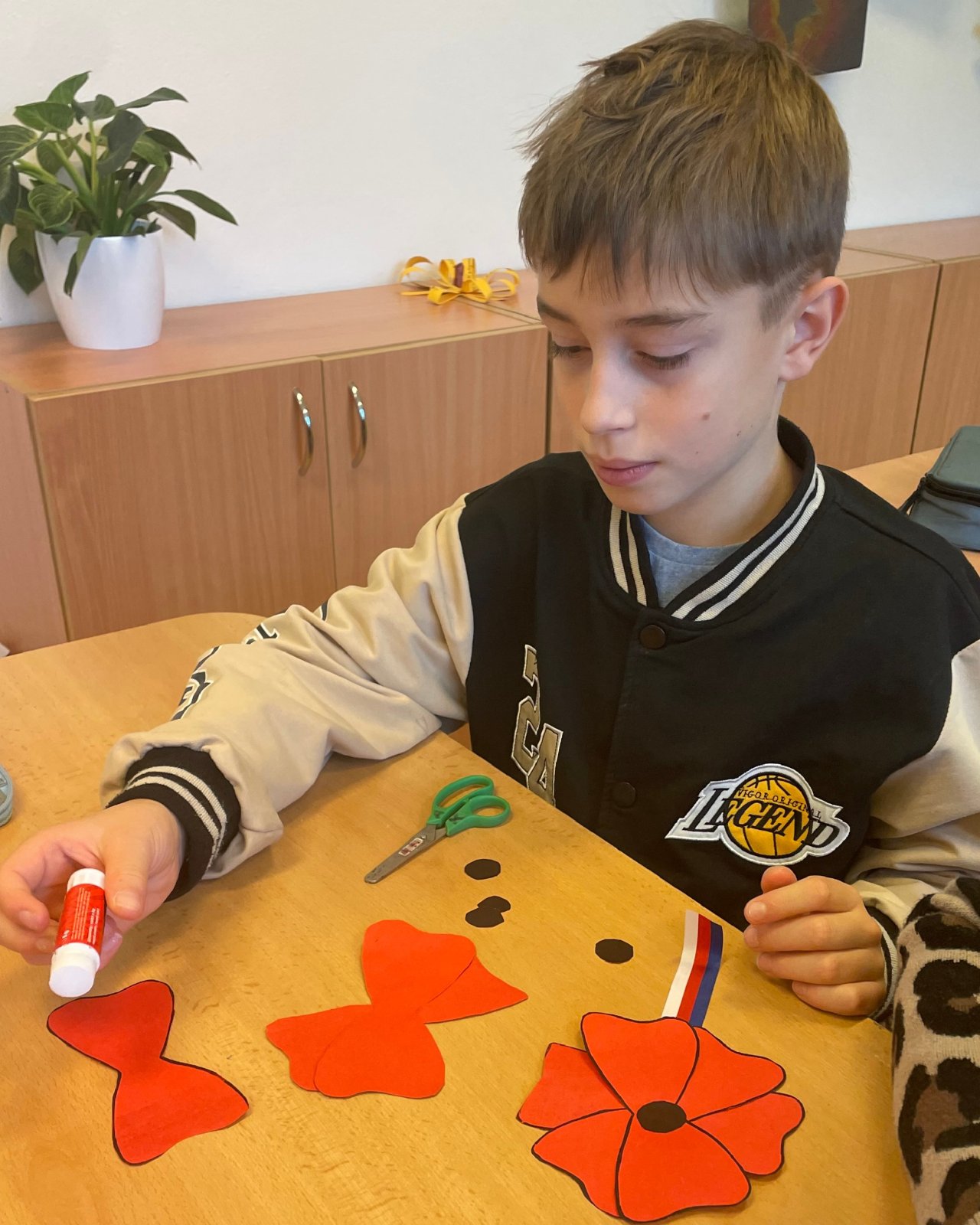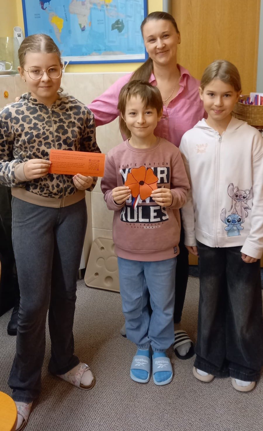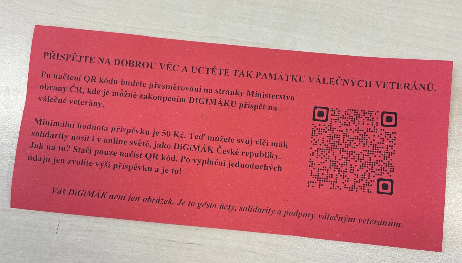 Čtvrťáčci se rozhodli vyrobit vlčí máky, které jsou v rámci tohoto svátku vnímány za symbol úcty k padlým vojákům. Vlčí máky rozdali mezi učitele, paní zástupkyně, pracovníky školy a jeden vlčí mák samozřejmě doputoval i k panu řediteli. QR kódem můžete přispět i vy, tak neváhejte a zapojte se! Přispějete tak na dobrou věc.