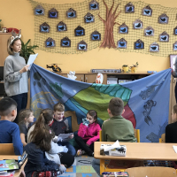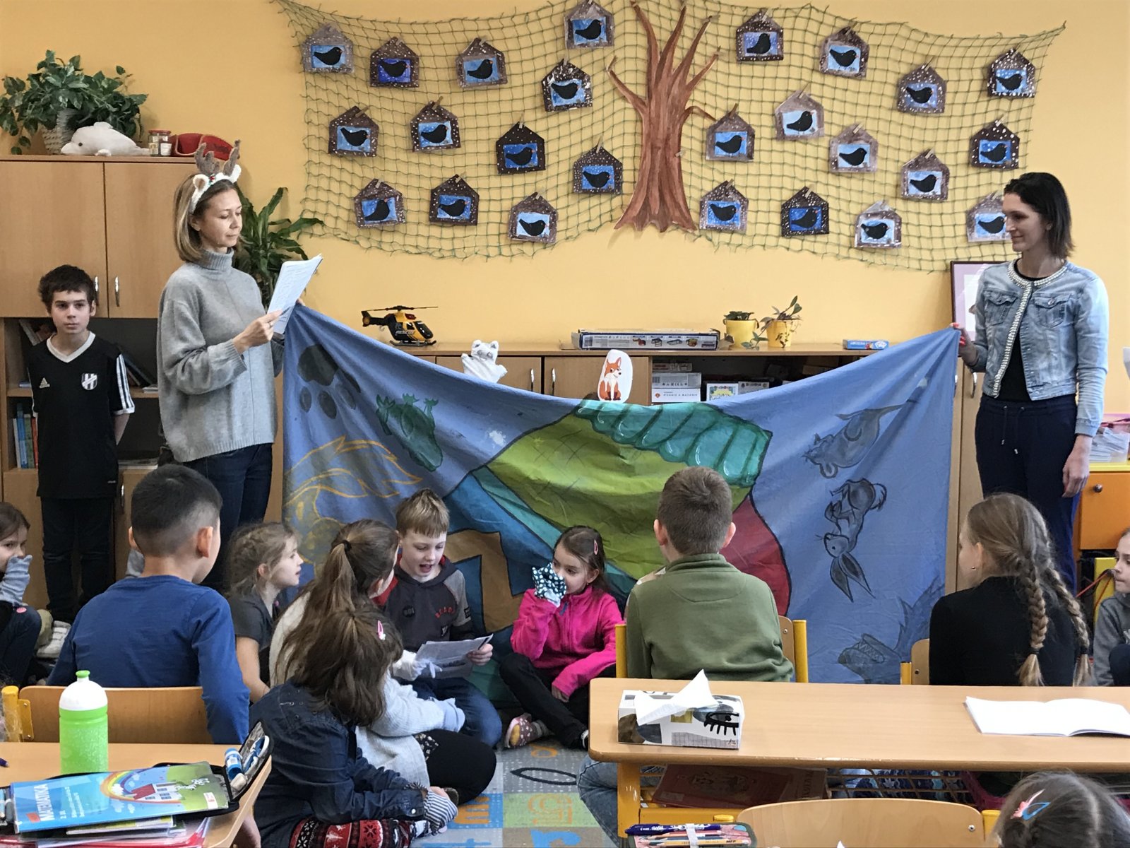 Těsně před jarními prázdninami jsme si s dětmi 1. E v rámci prvouky povídali o společenském chování na koncertech, v divadle a i jinde, když tu najednou…. Dveře se tiše otevřely a v nich se objevila paní učitelka Jitka Berková. Zeptala se, jestli může na návštěvu? Ano, jistě, proč by ne…. A to už jsme viděli, že za paní učitelkou nakukují do třídy žáčci z její třídy 3. E. Nebyla to ovšem obyčejná návštěva, starší děti si totiž pro nás připravily vystoupení, a tak jsme měli hned možnost si vyzkoušet, jak se slušně chovat v improvizovaném divadle. Nejprve jsme zhlédli ukrajinskou lidovou pohádku O ztracené rukavičce, pak následovala krátká přednáška o polárních oblastech naší planety a nutnosti tyto oblasti chránit a nakonec jsme si poslechli písničku Antarktida v doprovodu kytary. Celý program se nám moc líbil a náramně jsme si to všichni užili. A protože se tréma u třeťáčků - herců u nás ve třídě vytratila, mohli své vystoupení předvést i v dalších třídách.