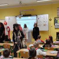 Čertíci si mezi malými žáčky vyhledali kamarády, aby jim řekli, jak to v takovém pekle probíhá a jaké je tam veliké teplo. Andílci zase MOOOC chválili krásné známky v žákovských knížkách a při rozloučení rozdali dětem jablíčka.