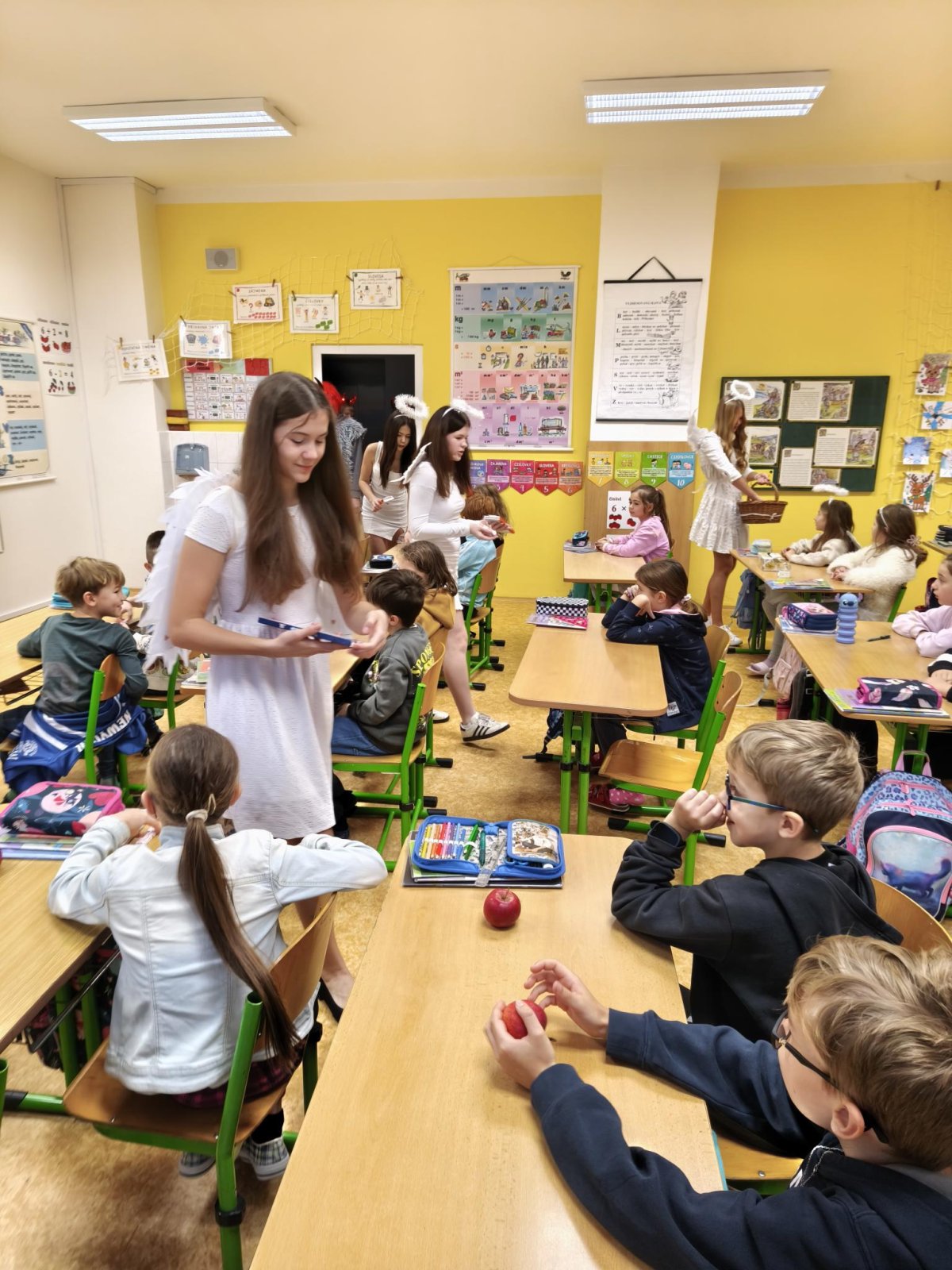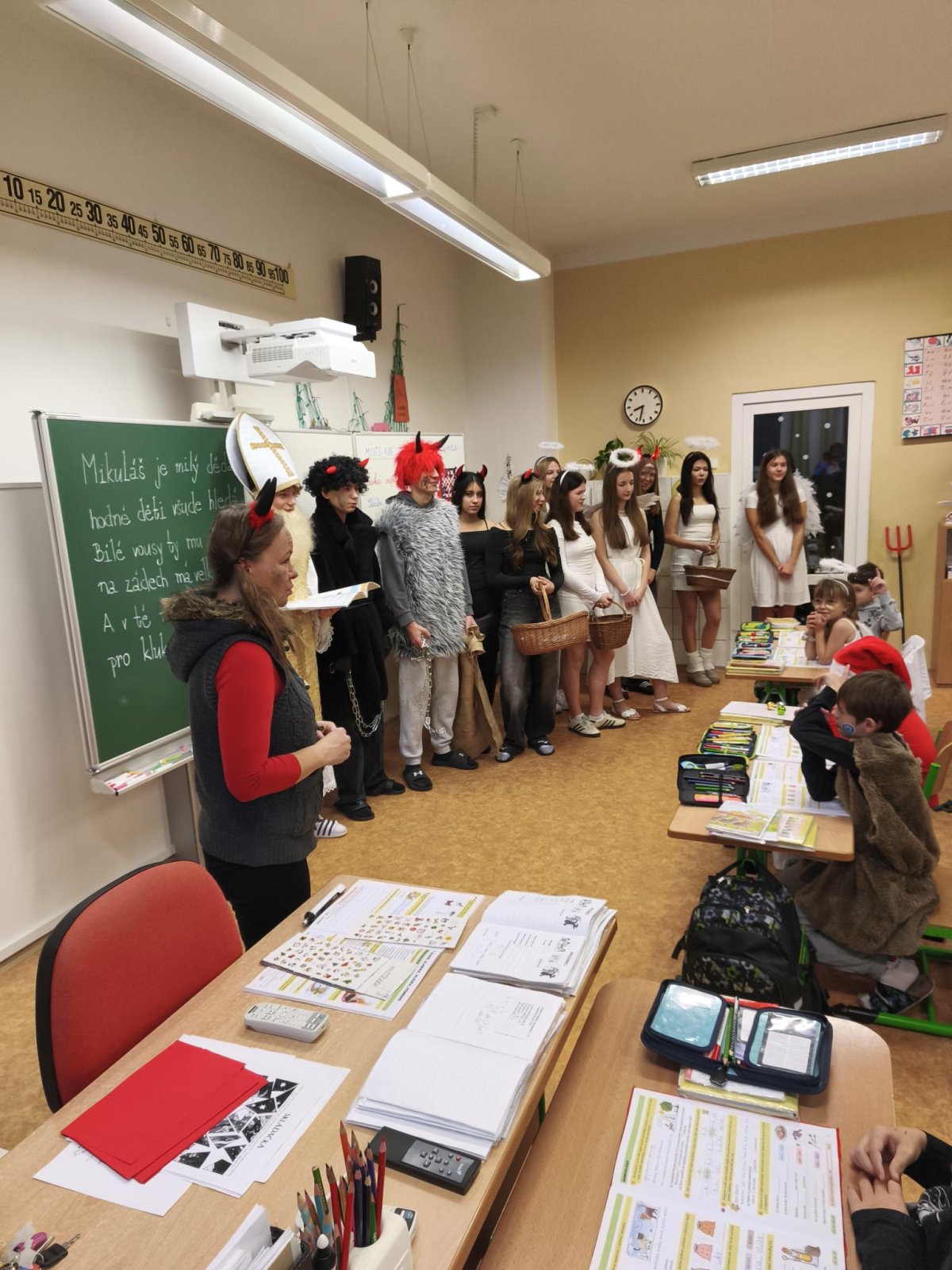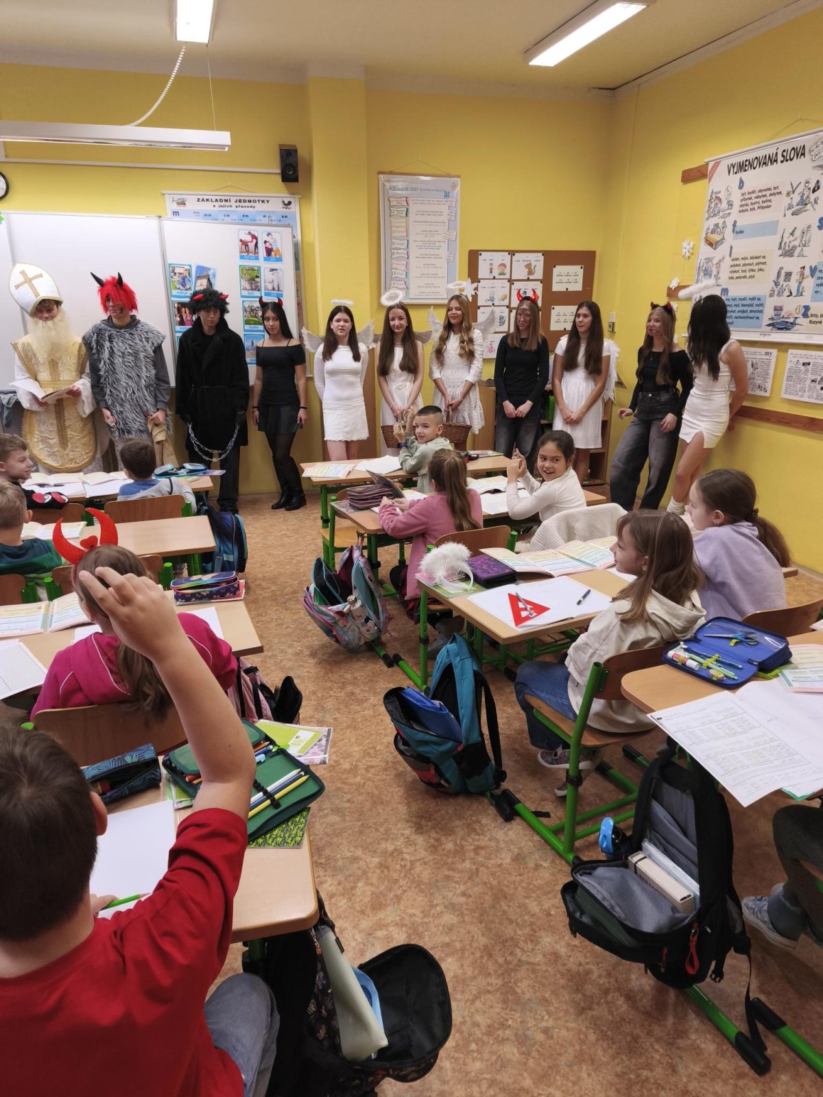 Hned v první vyučovací hodině bylo slyšet jemné řinčení řetězů… A je to tady! Otevírají se dveře a do třídy vbíhají čertíci, kteří naštěstí nejsou zlí, ale přišli si najít další kamarády. A hádáte správně, naši stateční nejmladší školáci si s čertíky povídali, smáli se a taky si s nimi zatančili. Pak následoval proslov pana Mikuláše, který pochválil šikovné a hodné děti a dal pokyn krásným andílkům, aby dětem rozdali ovoce.