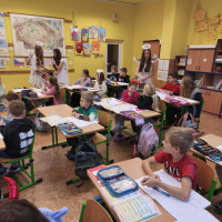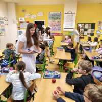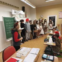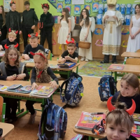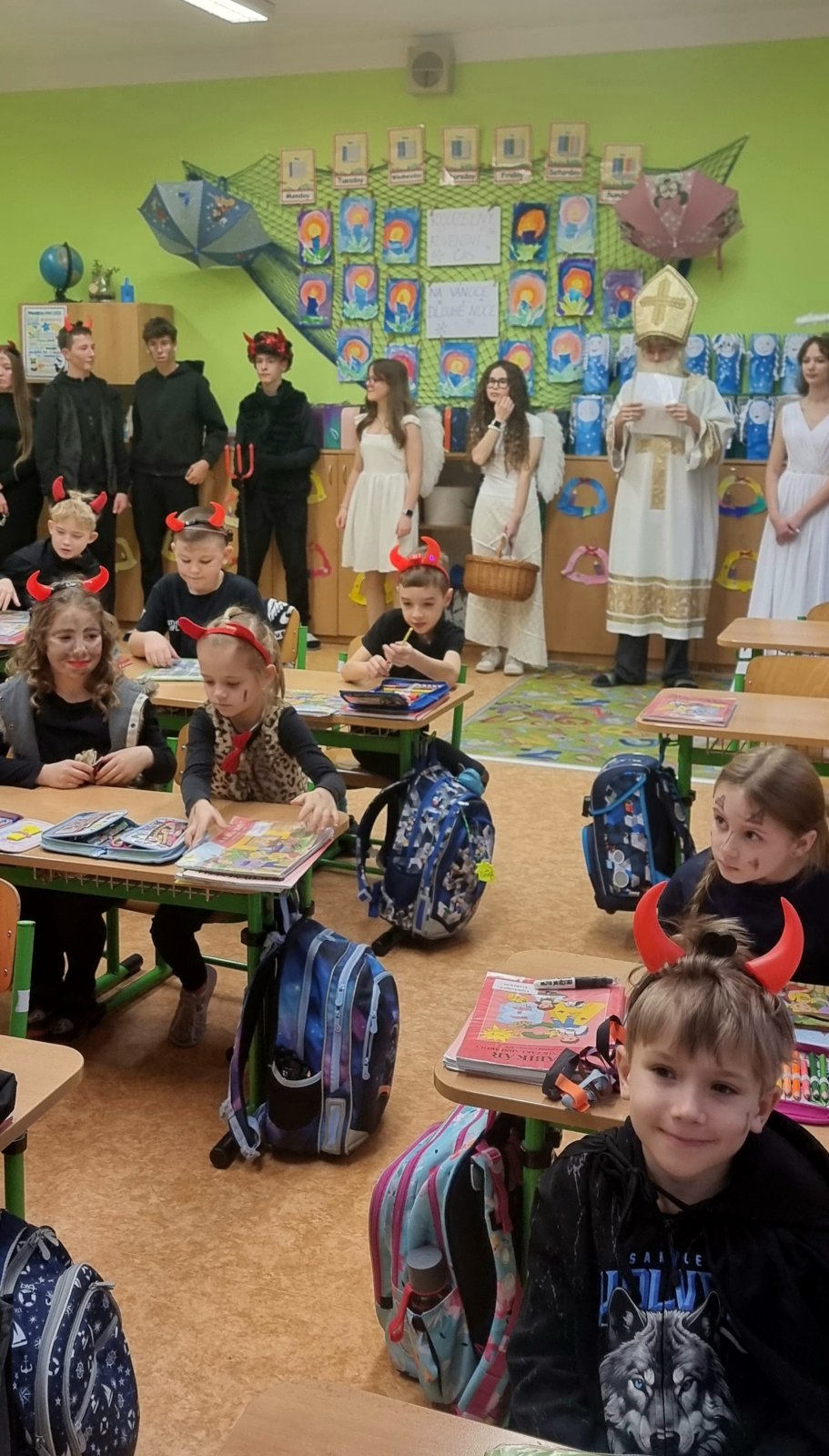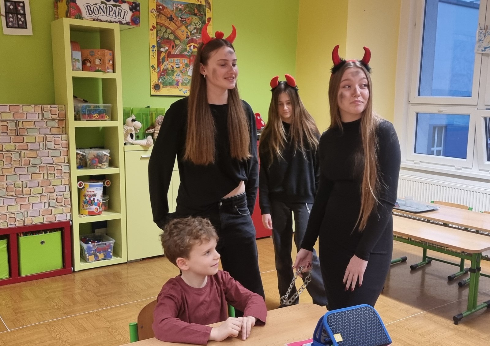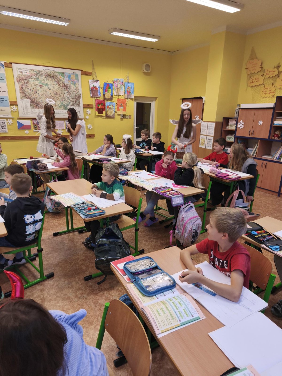 Hned v první vyučovací hodině bylo slyšet jemné řinčení řetězů… A je to tady! Otevírají se dveře a do třídy vbíhají čertíci, kteří naštěstí nejsou zlí, ale přišli si najít další kamarády. A hádáte správně, naši stateční nejmladší školáci si s čertíky povídali, smáli se a taky si s nimi zatančili. Pak následoval proslov pana Mikuláše, který pochválil šikovné a hodné děti a dal pokyn krásným andílkům, aby dětem rozdali ovoce.