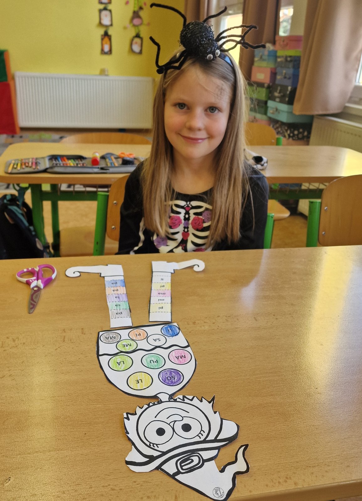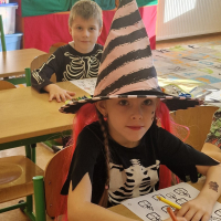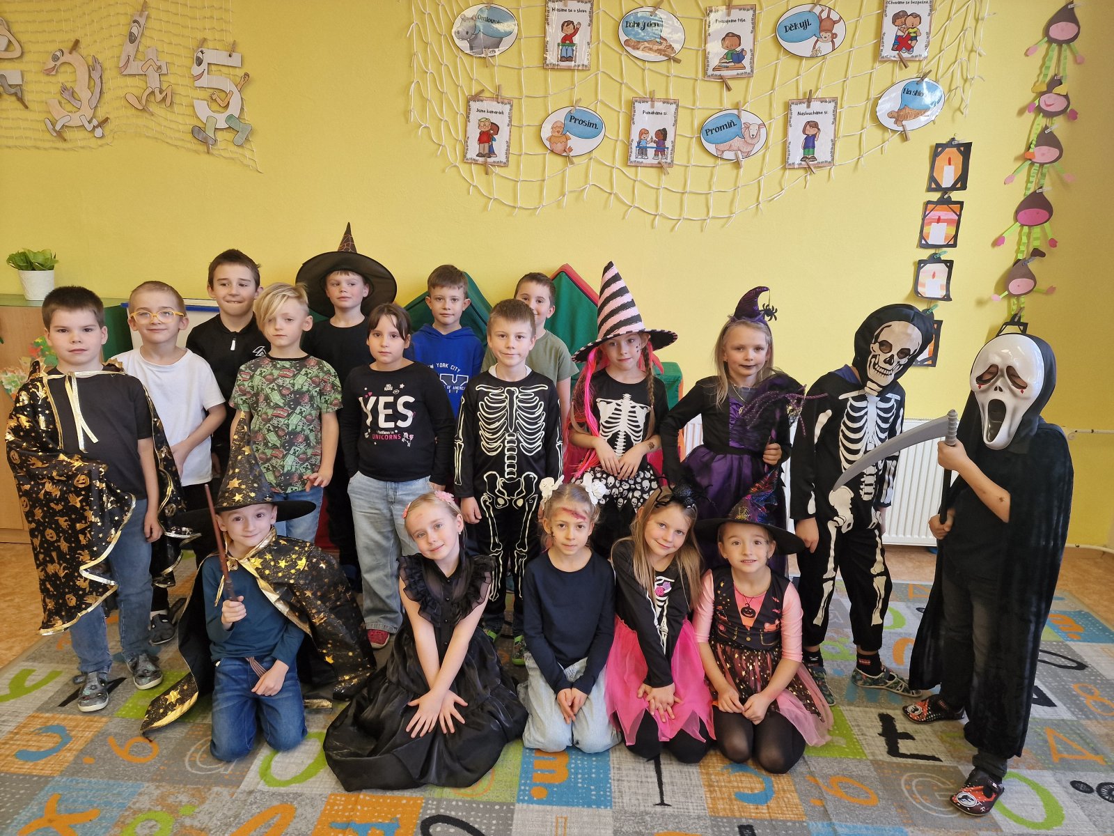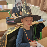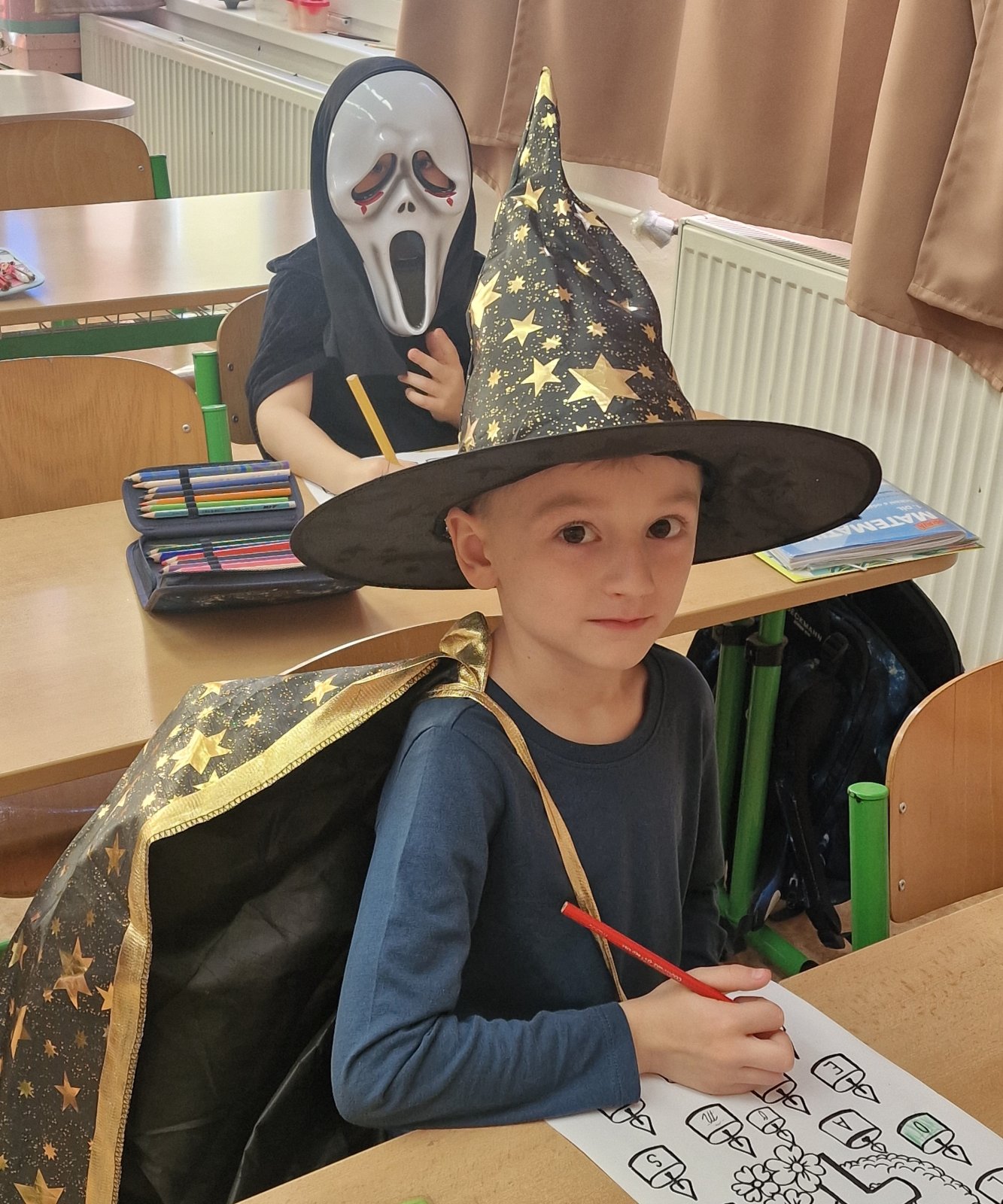 Páteční den se v první třídě proměnil v kouzelně temnou atmosféru. Místo běžného školního ruchu seděli v lavicích kostlivci, duchové a další tajemná stvoření. Děti si užily den plný fantazie, poznávání a zábavy, který jsme věnovali dvěma významným svátkům: Dušičkám a Halloweenu.