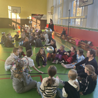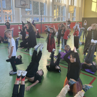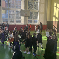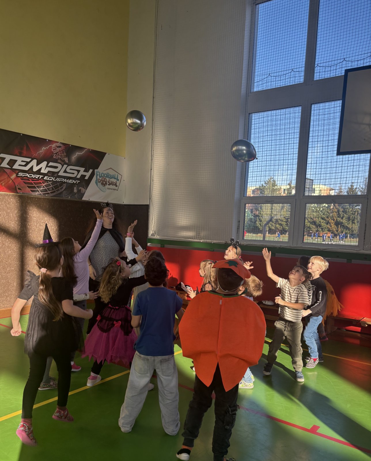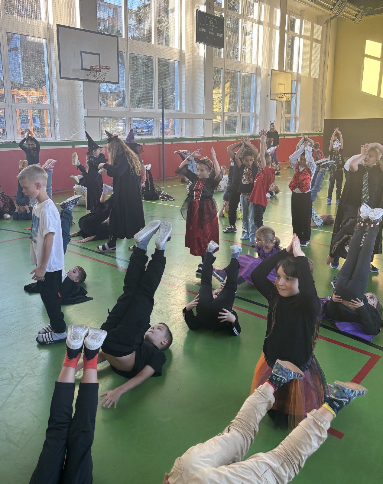 Strašidla ze všech oddělní se sešla v tělocvičně, kde tančila na hudbu s danou tématikou. Tanec nám zpestřilo několik aktivit - udržení duchů nad hlavou, předávání dýní či molekuly. Fantazii a kreativitu tanečníků prověřila skladba, kde se strašidla měnila na různé předměty či postavy.