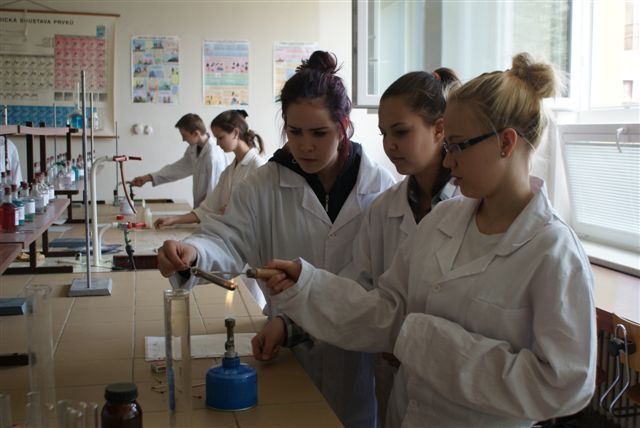 Náš výlet začal už tady u nás ve škole a s úsměvem jsme se vydali na nedalekou školu – Gymnázium Čajkovského. Bylo to zase něco jiného a pro nás nového. Vítali nás, jak se říká, s otevřenou náručí a hned jsme se pustili do prvního pokusu. Zahráli jsme si na takové nové malé chemičky a chemiky. Každý pokus se nám povedl a nikdo nepřišel k úrazu. Následovalo povídání o kovech a nekovech a pak radostná cesta zase zpátky na Heyrák. Martina Bednářová, 8.B