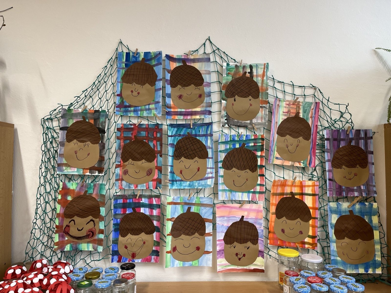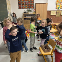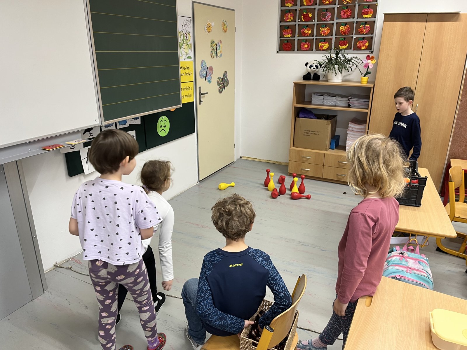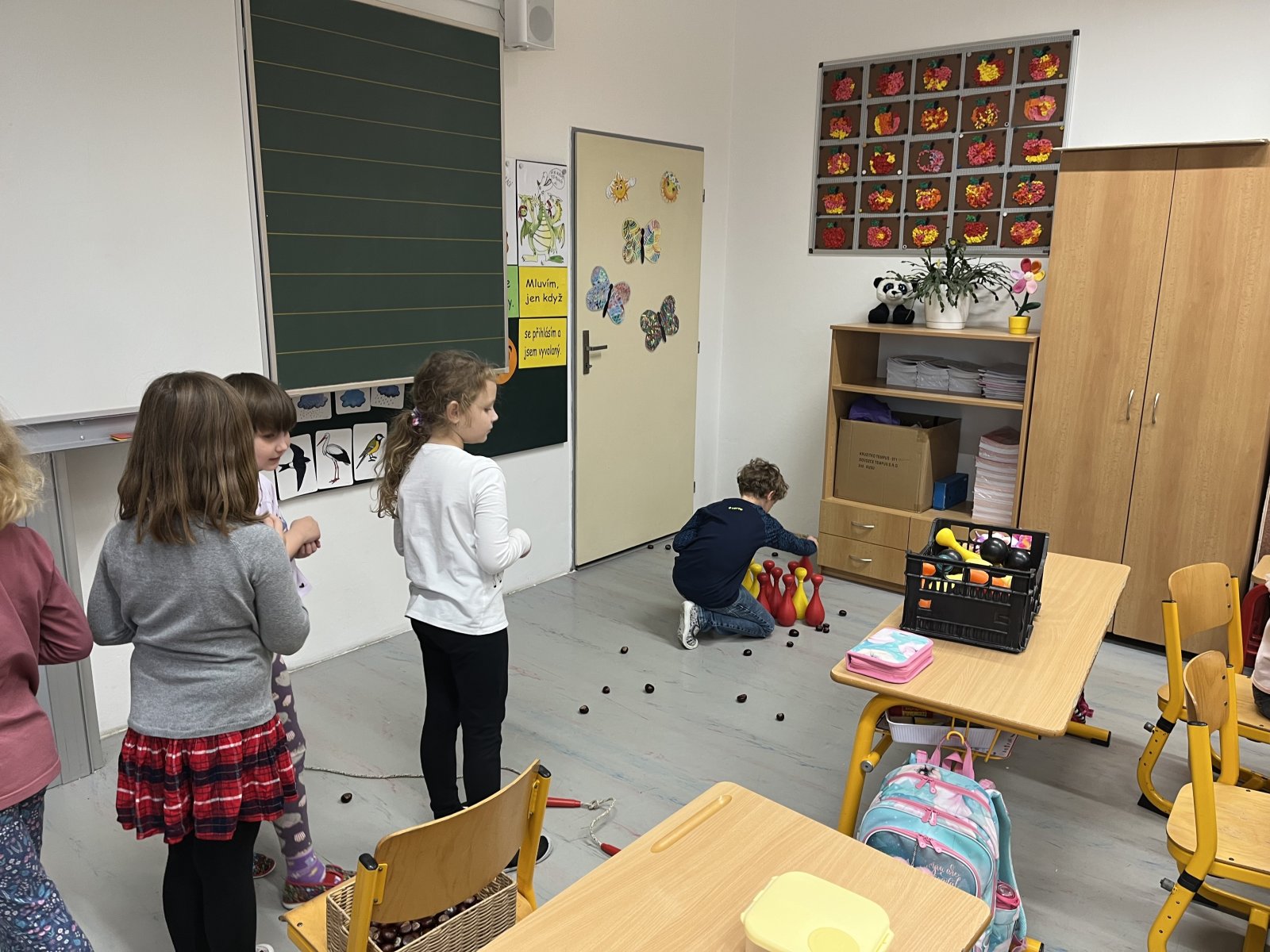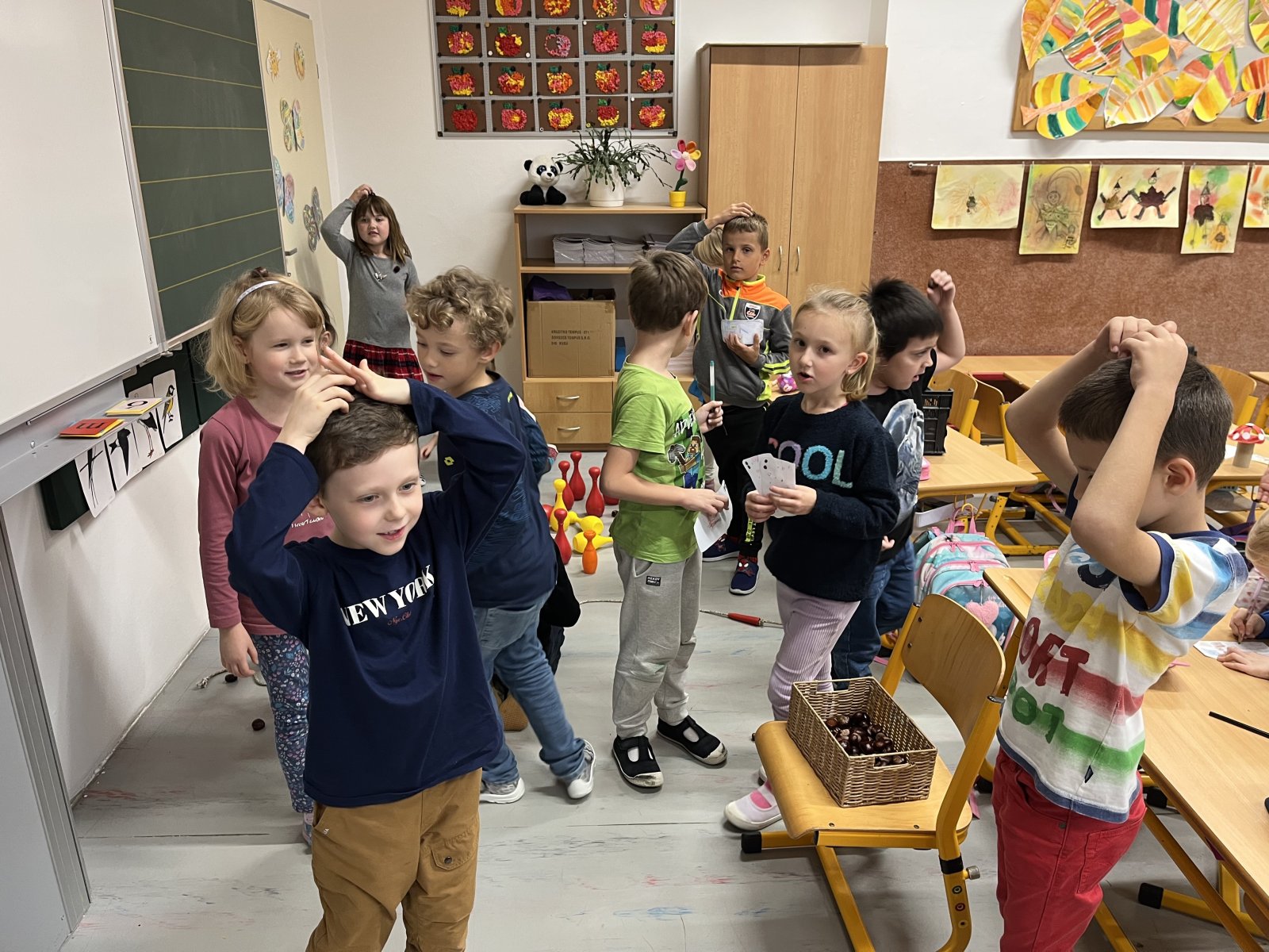 V průběhu října jsme pozorovali změny v přírodě – barvící se listí, padající kaštany a žaludy, proměny počasí. U příležitosti Dne stromů jsme si povídali o významu stromů pro člověka i přírodu a ve spojitosti s touto tematikou tvořily děti krásné podzimní stromy z papíru i přírodnin. Velkou oblibou se pro děti staly také hry s kaštany – zkoušeli jsme kaštanový bowling, balancování s kaštany a kreslení kaštany, kdy nechyběla spousta smíchu a kreativity.