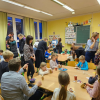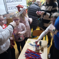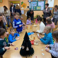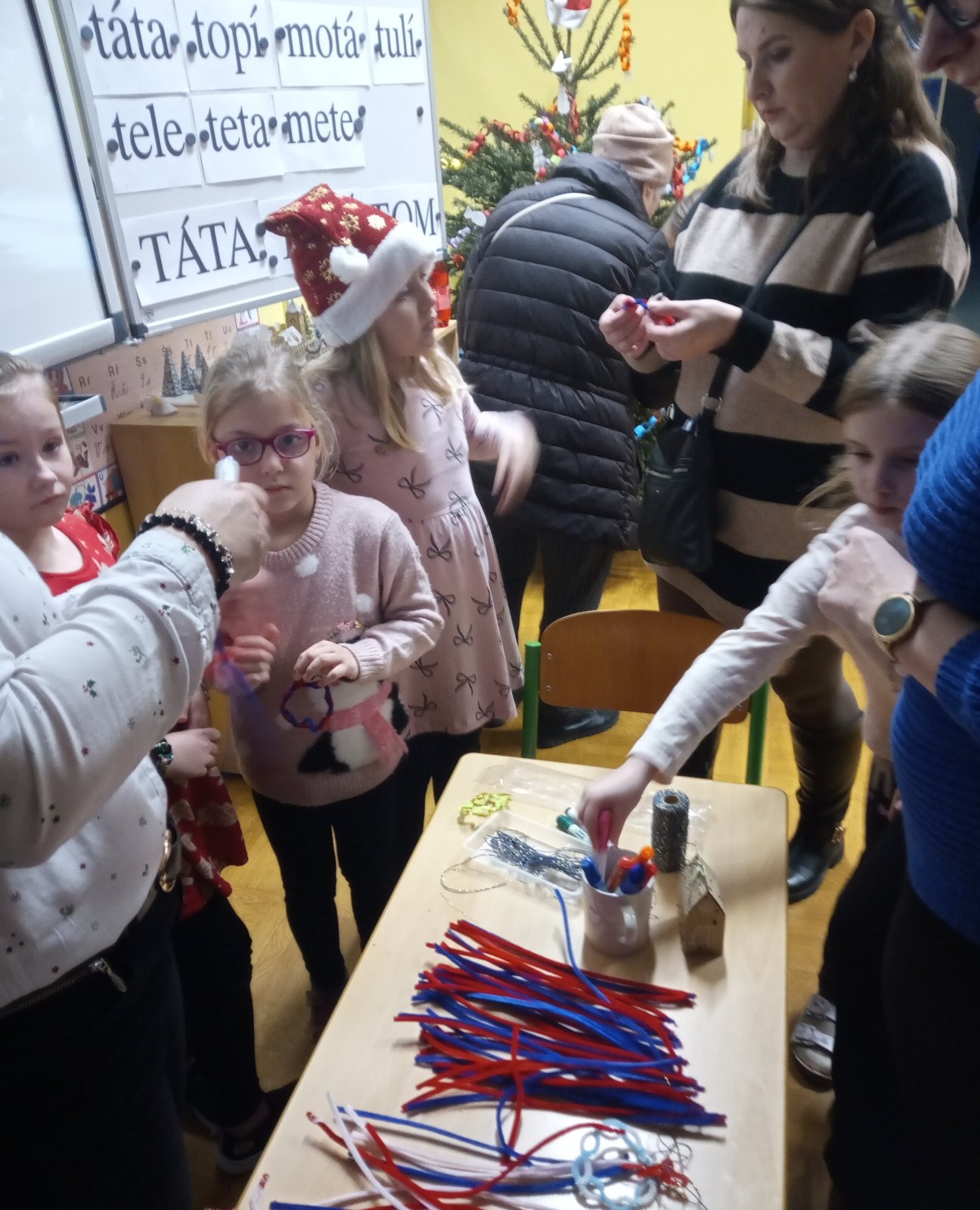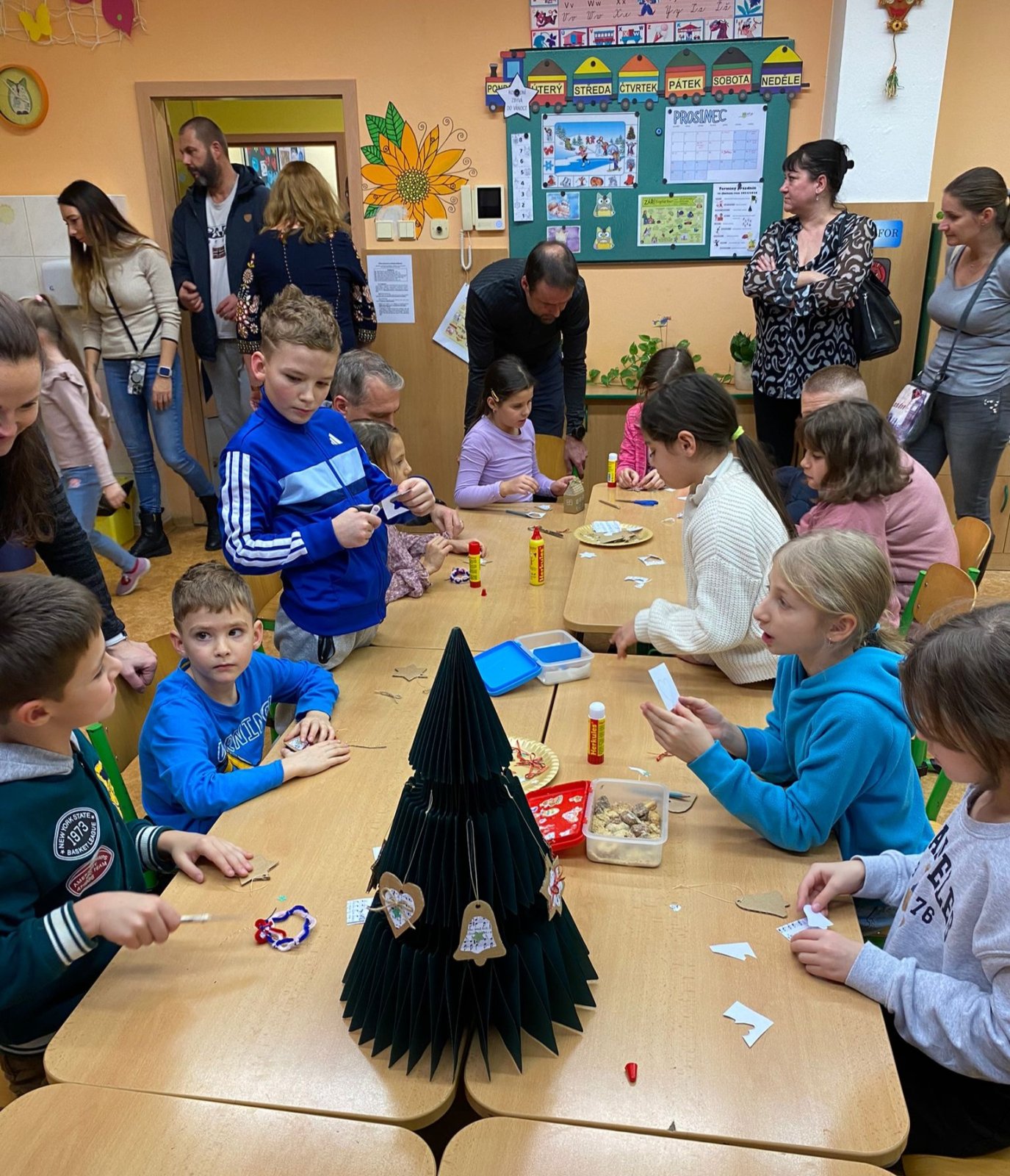 Děti společně s rodiči i prarodiči vyráběly pod vedením paních vychovatelek vánoční dekorace: domečky z papíru, ozdoby na stromeček - hvězdičky, zvonečky nebo vánoční květiny. Nadšené a zaujaté tváře dětí byly důkazem, že si společné tvoření užívají. Výrobky si pak každý odnesl domů. Čas zbyl i na zpěv vánočních písní a koled v doprovodu cinkání zvonečků.