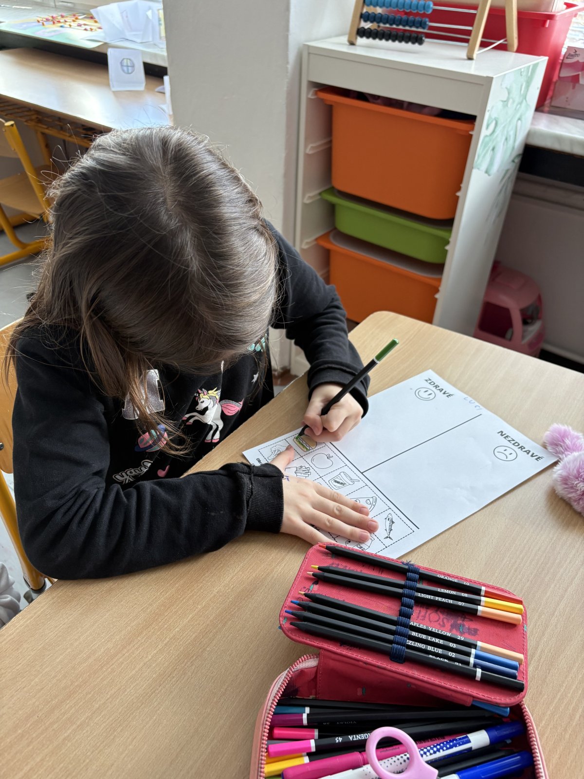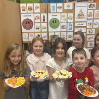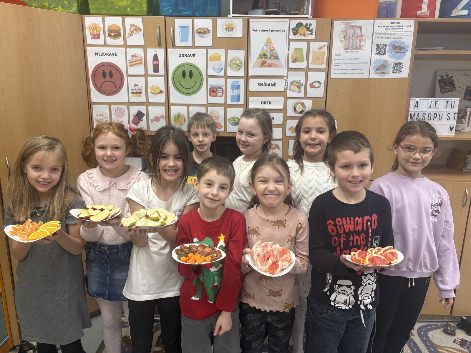Děti plnily různé zábavné i naučné úkoly, při kterých se učily rozlišovat zdravé a méně vhodné potraviny, skládaly jídelníček na jeden den a přemýšlely o tom, proč je důležité jíst pravidelně a pestře. Společně jsme si také povídali o významu pohybu, pitného režimu a dostatku odpočinku.