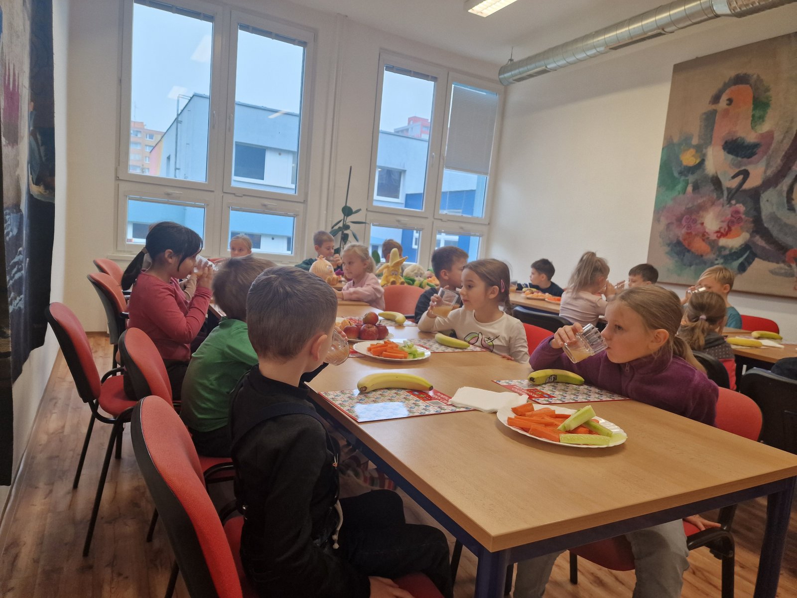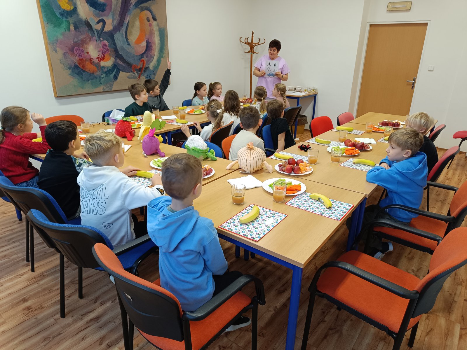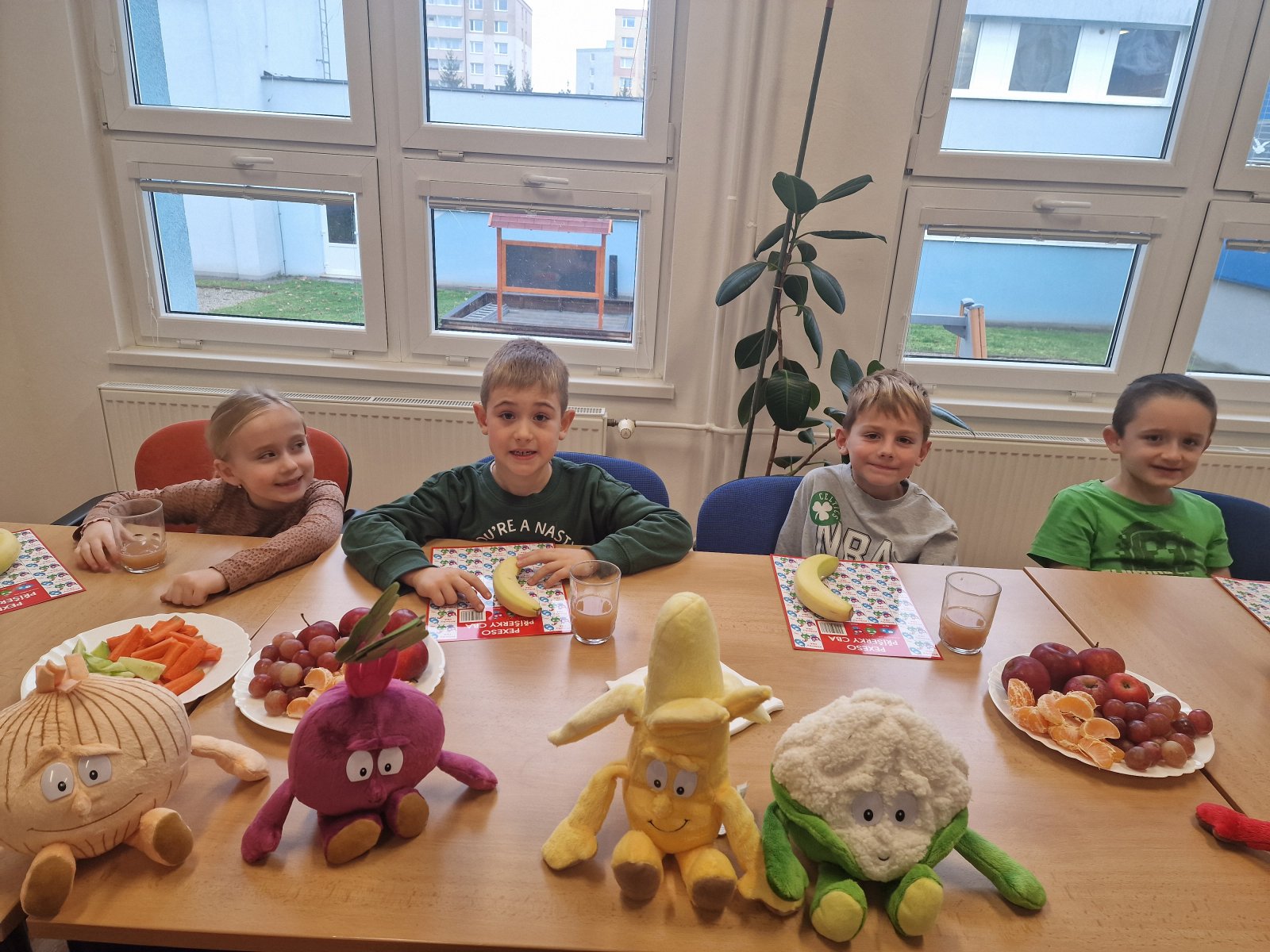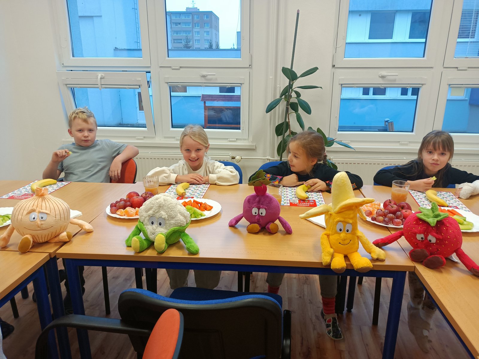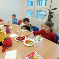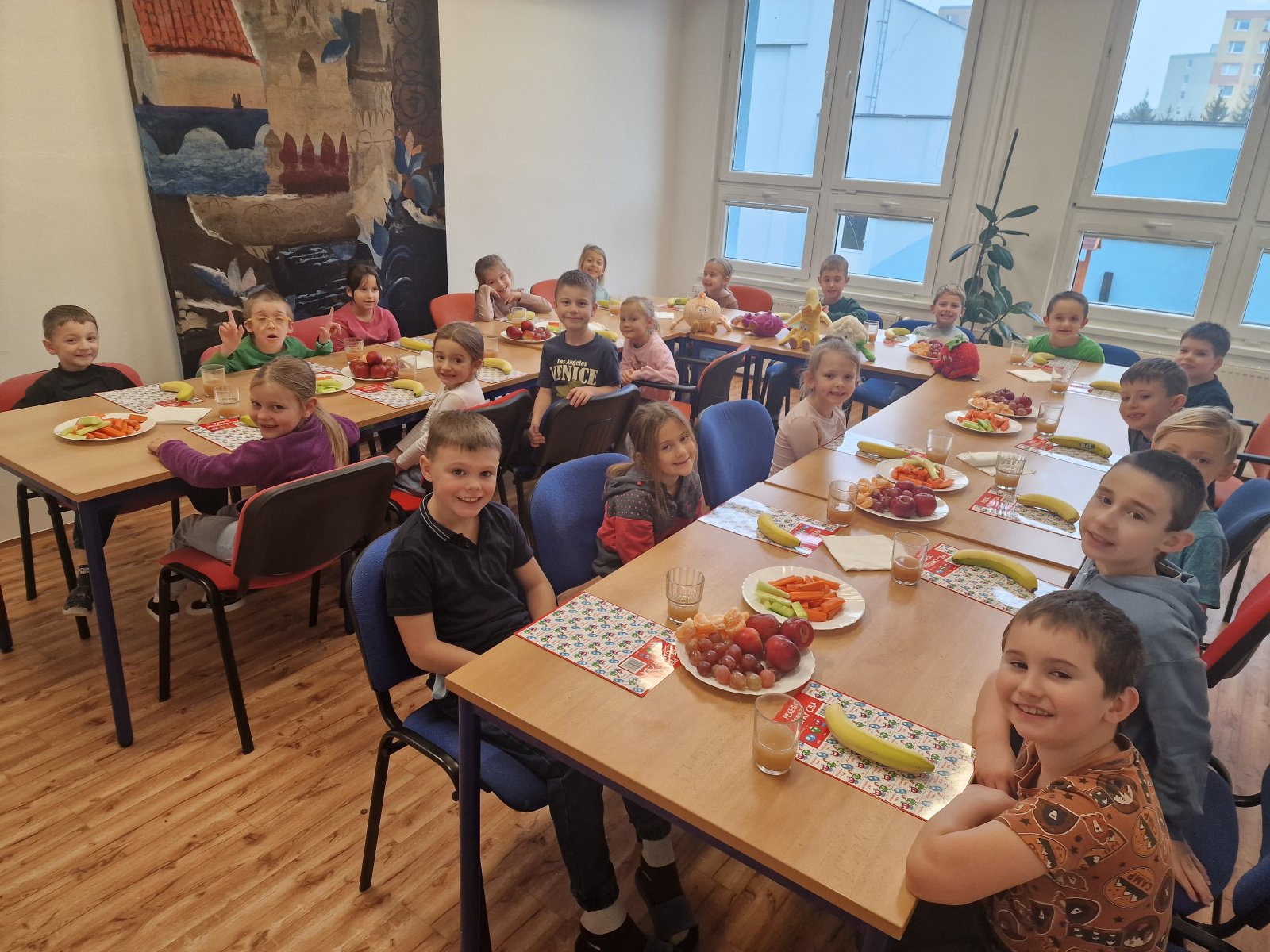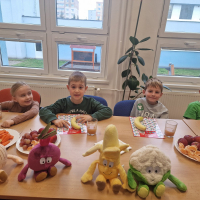 To ale není vše! V průběhu dne všichni nadšeně zpívali libozvučné písničky v angličtině o vitamínech a ovoci, v matematice je čekalo ovocné počítání a v českém jazyce ovocné hádanky. Jelikož je při obědech u všech patrná neutuchající touha získat kompot, když je zrovna na menu, nemohla chybět ani hra „kompot“, při které děti trénovaly hrubou motoriku a znalosti v oblasti druhů ovoce. V tento den děti také tvořily. Obrázek ovoce musely složit tak, aby se dal otevírat. Vznikl tím obrázek s překvapením. Ten si potom vymalovaly. Na závěr si žáčci své nejoblíbenější ovoce i zeleninu vymodelovali z plastelíny.