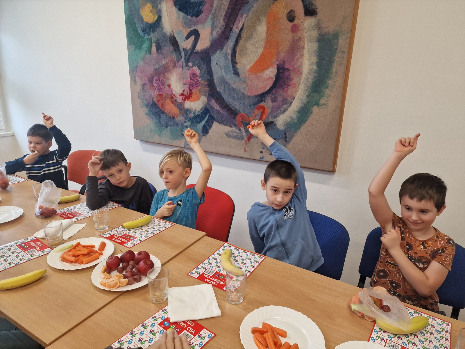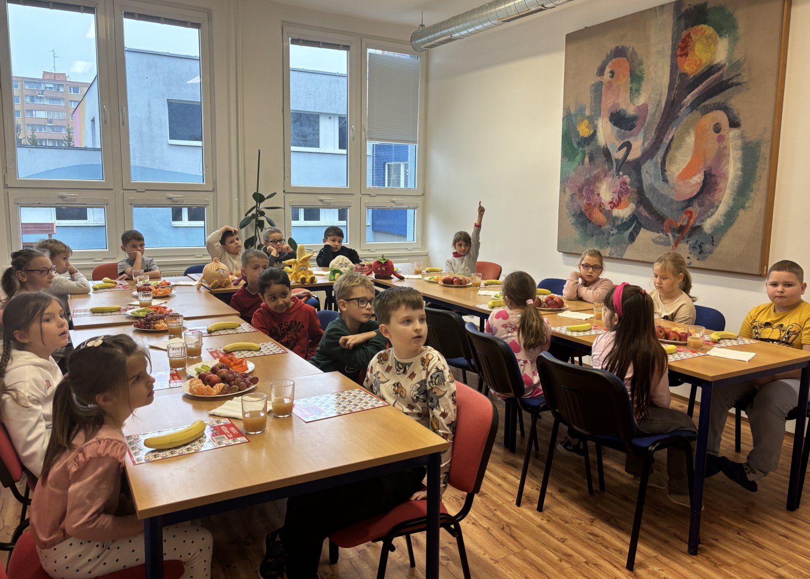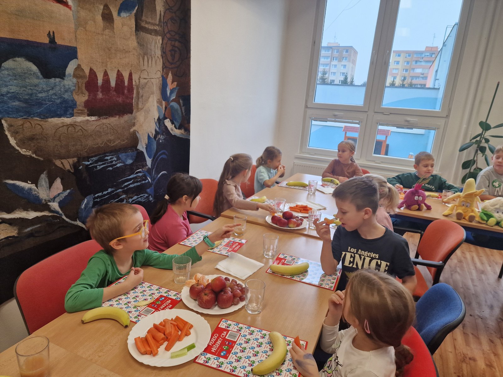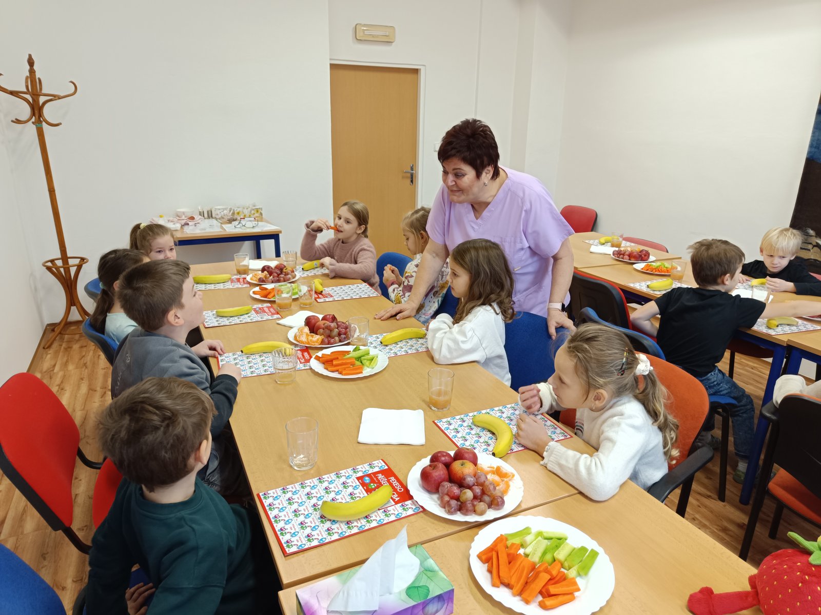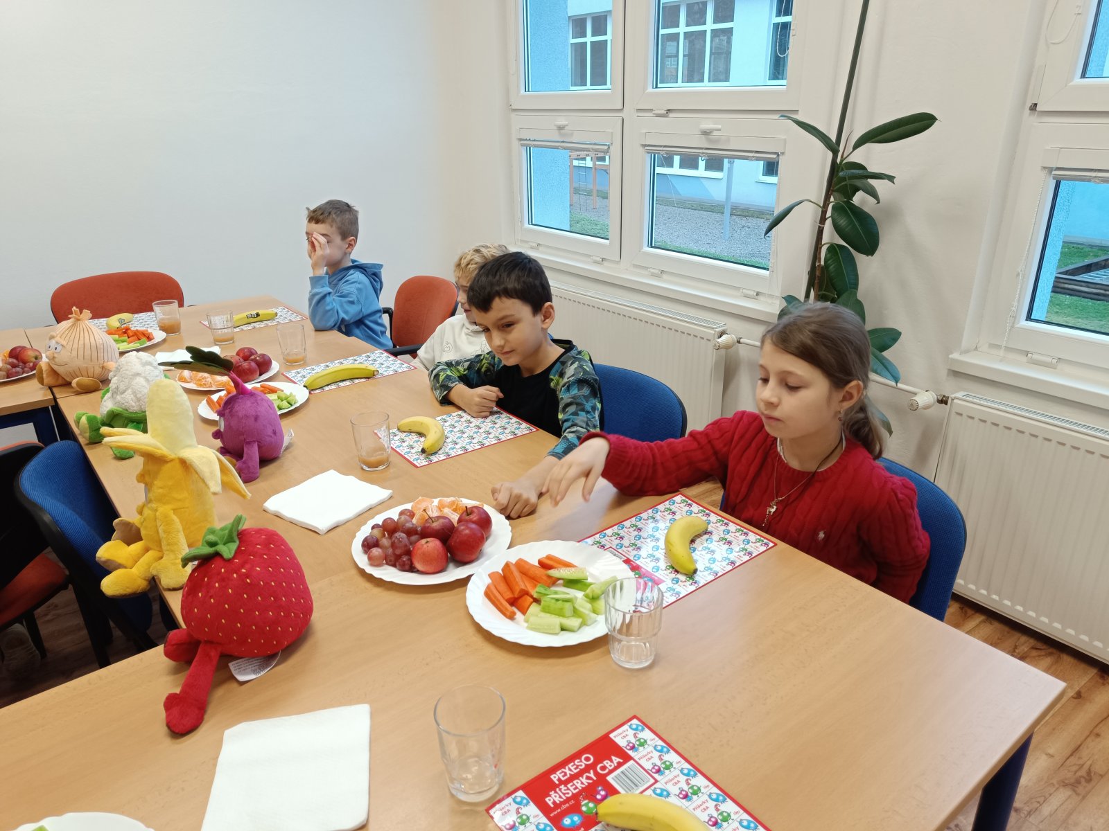 To ale není vše! V průběhu dne všichni nadšeně zpívali libozvučné písničky v angličtině o vitamínech a ovoci, v matematice je čekalo ovocné počítání a v českém jazyce ovocné hádanky. Jelikož je při obědech u všech patrná neutuchající touha získat kompot, když je zrovna na menu, nemohla chybět ani hra „kompot“, při které děti trénovaly hrubou motoriku a znalosti v oblasti druhů ovoce. V tento den děti také tvořily. Obrázek ovoce musely složit tak, aby se dal otevírat. Vznikl tím obrázek s překvapením. Ten si potom vymalovaly. Na závěr si žáčci své nejoblíbenější ovoce i zeleninu vymodelovali z plastelíny.