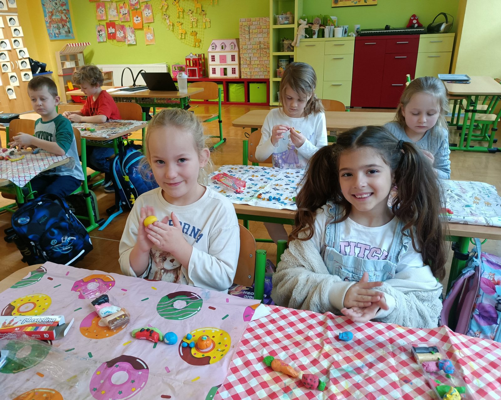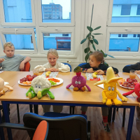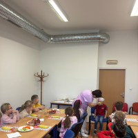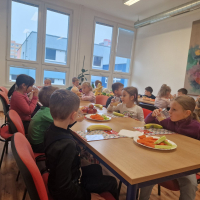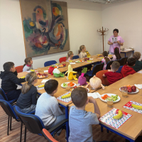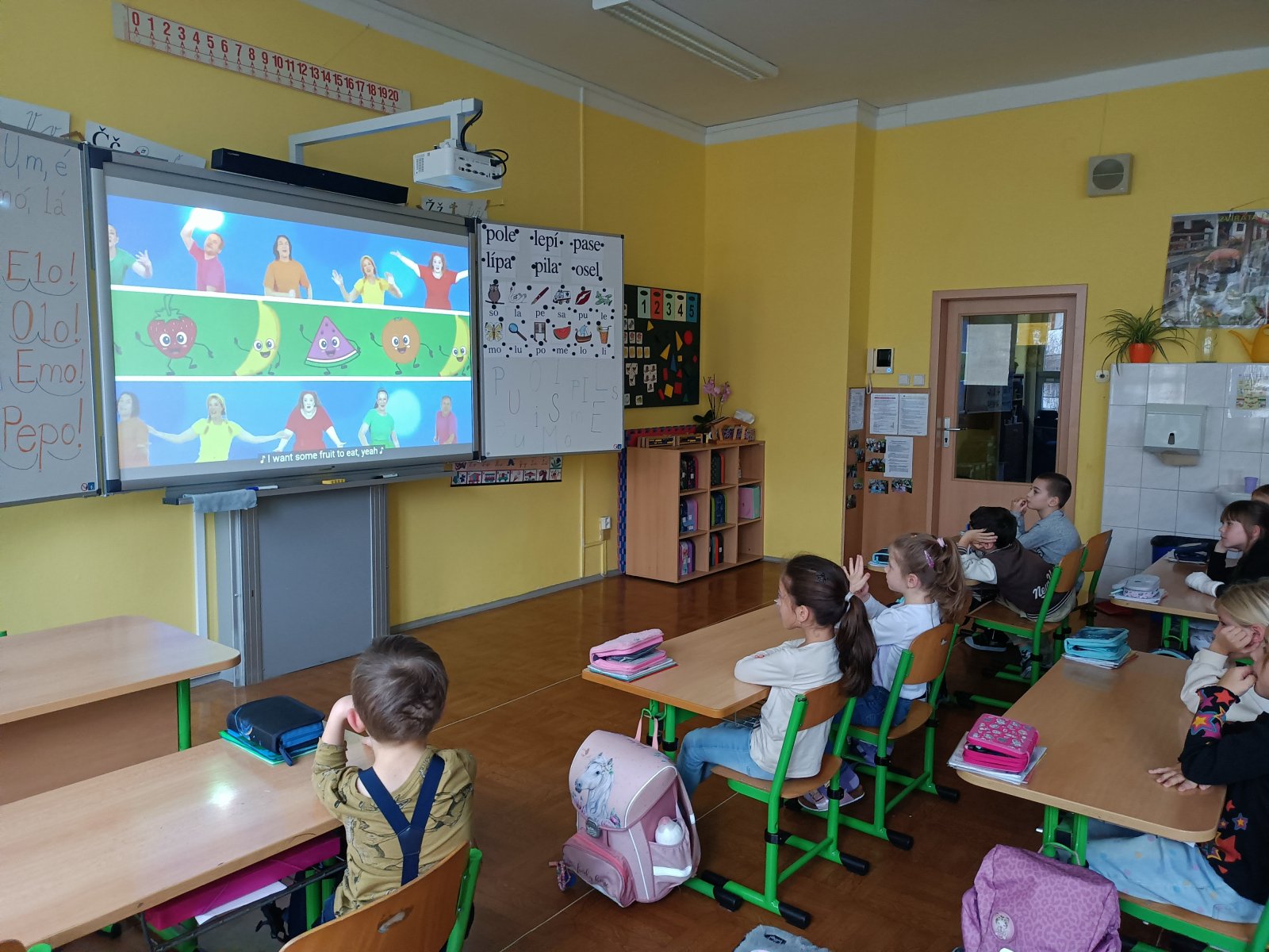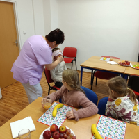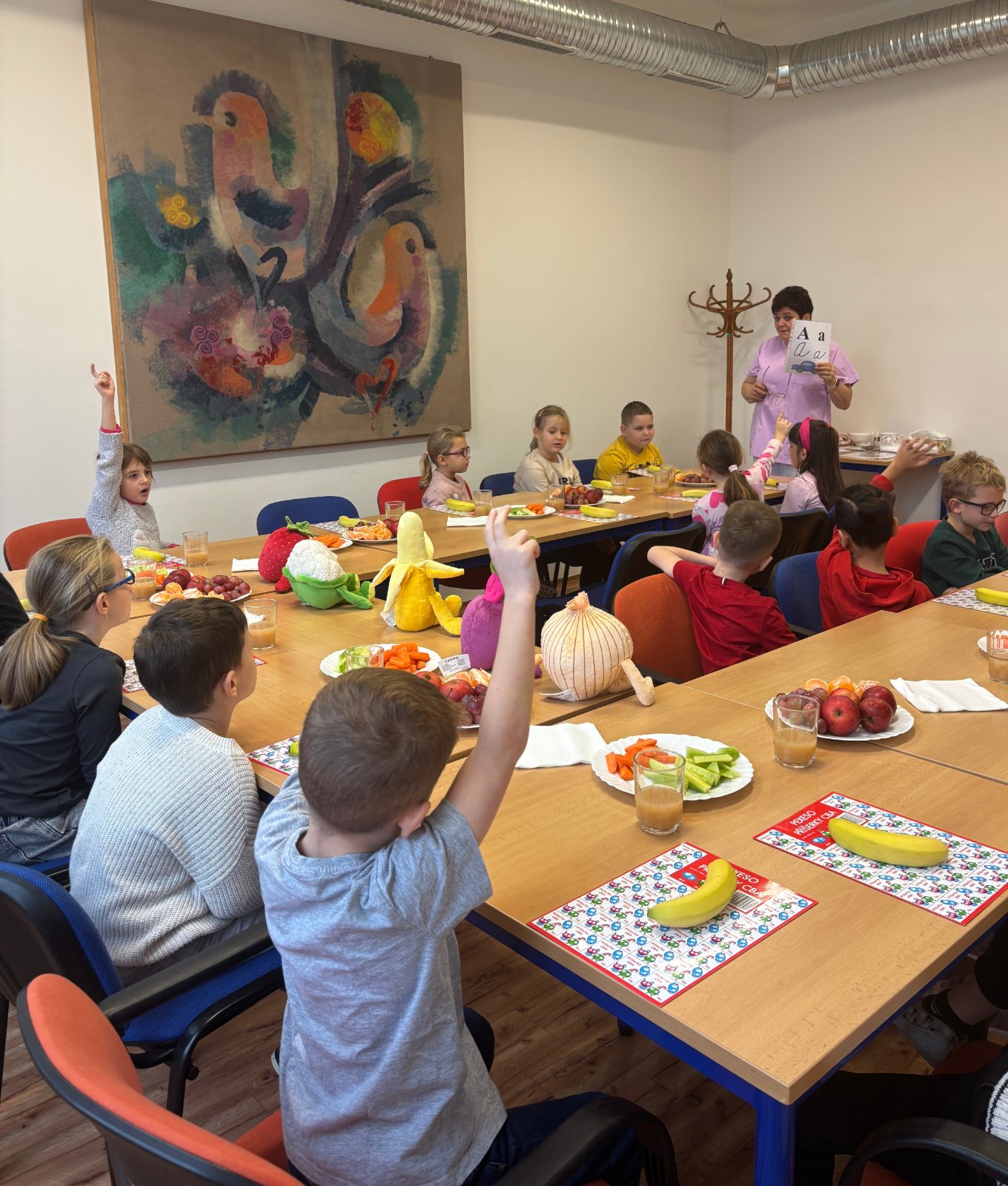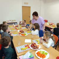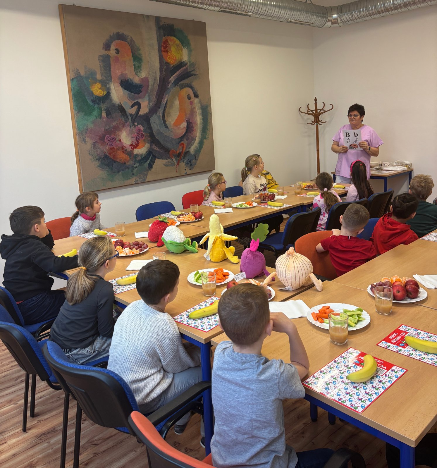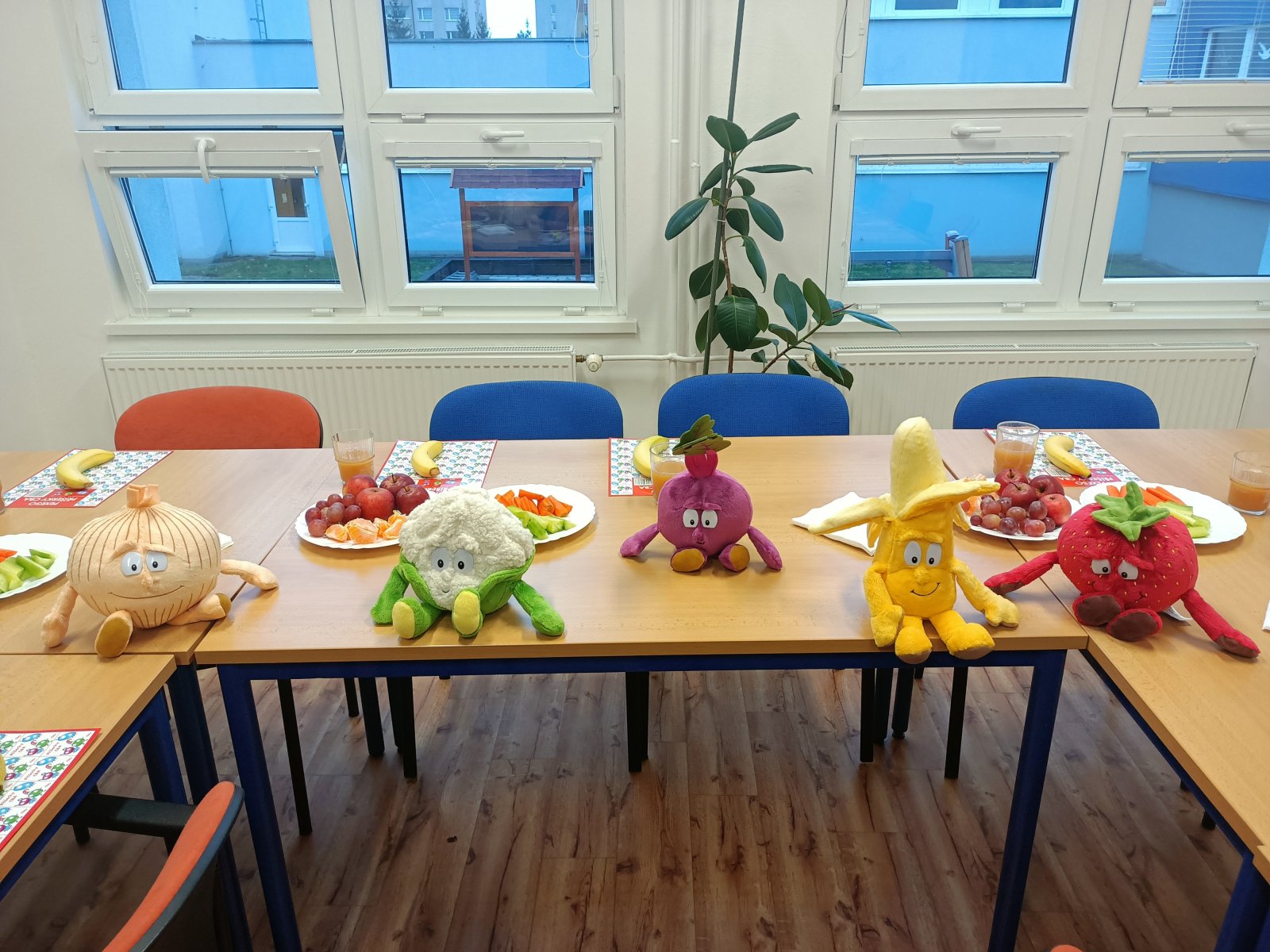 To ale není vše! V průběhu dne všichni nadšeně zpívali libozvučné písničky v angličtině o vitamínech a ovoci, v matematice je čekalo ovocné počítání a v českém jazyce ovocné hádanky. Jelikož je při obědech u všech patrná neutuchající touha získat kompot, když je zrovna na menu, nemohla chybět ani hra „kompot“, při které děti trénovaly hrubou motoriku a znalosti v oblasti druhů ovoce. V tento den děti také tvořily. Obrázek ovoce musely složit tak, aby se dal otevírat. Vznikl tím obrázek s překvapením. Ten si potom vymalovaly. Na závěr si žáčci své nejoblíbenější ovoce i zeleninu vymodelovali z plastelíny.