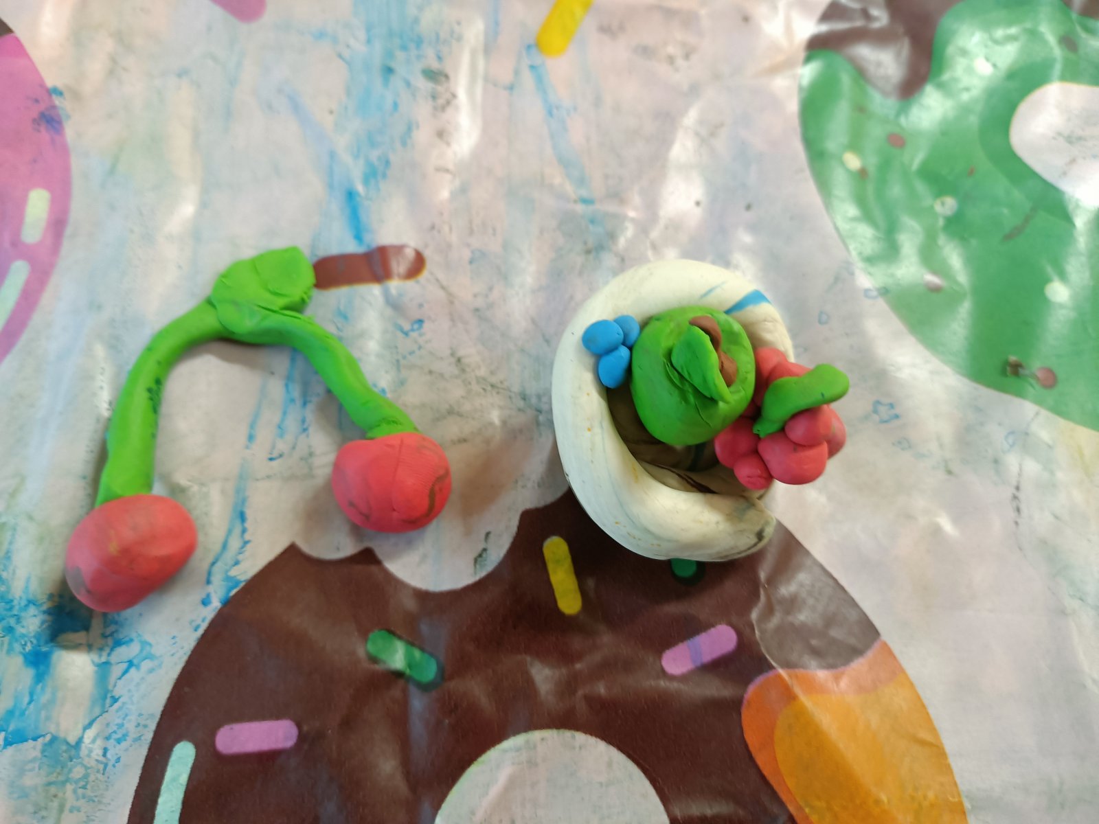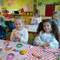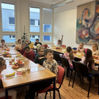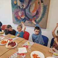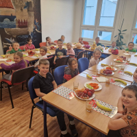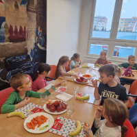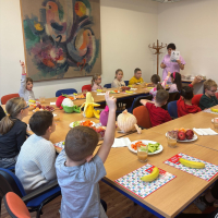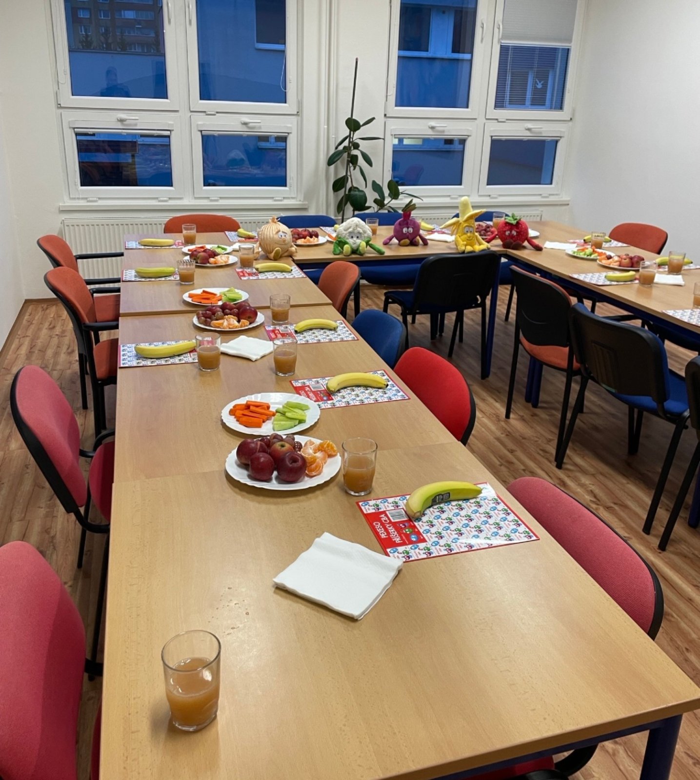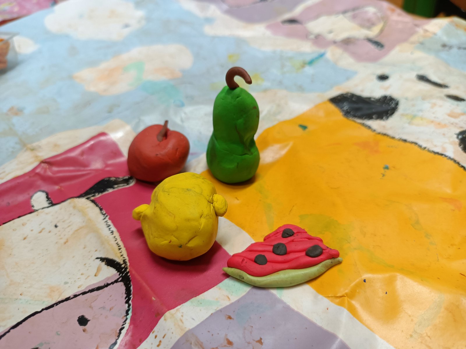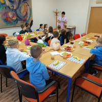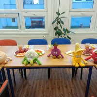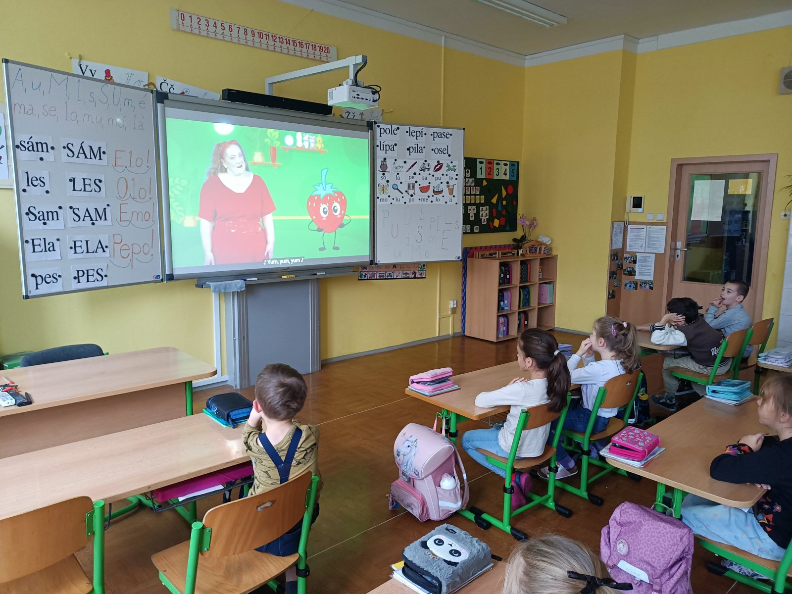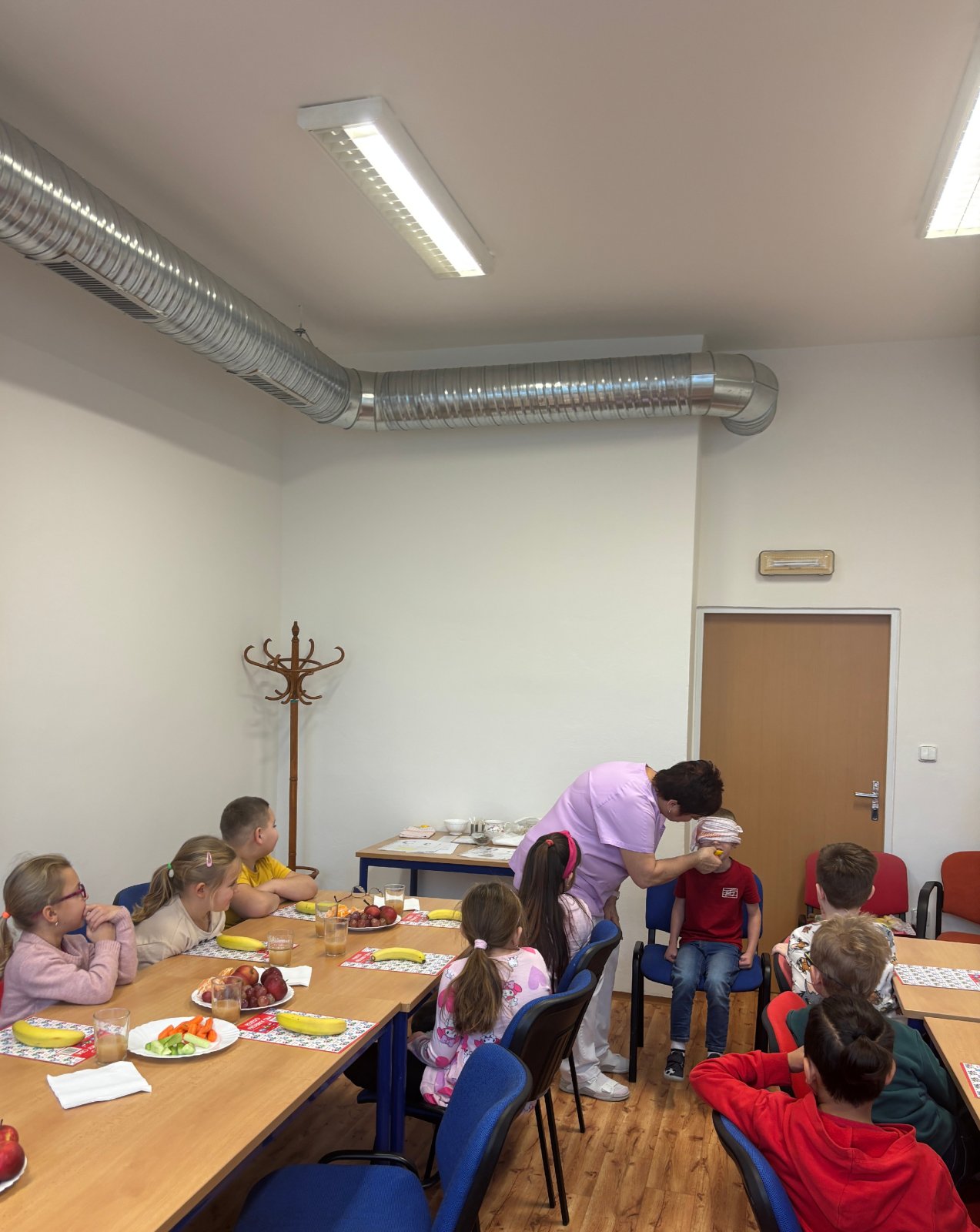 To ale není vše! V průběhu dne všichni nadšeně zpívali libozvučné písničky v angličtině o vitamínech a ovoci, v matematice je čekalo ovocné počítání a v českém jazyce ovocné hádanky. Jelikož je při obědech u všech patrná neutuchající touha získat kompot, když je zrovna na menu, nemohla chybět ani hra „kompot“, při které děti trénovaly hrubou motoriku a znalosti v oblasti druhů ovoce. V tento den děti také tvořily. Obrázek ovoce musely složit tak, aby se dal otevírat. Vznikl tím obrázek s překvapením. Ten si potom vymalovaly. Na závěr si žáčci své nejoblíbenější ovoce i zeleninu vymodelovali z plastelíny.