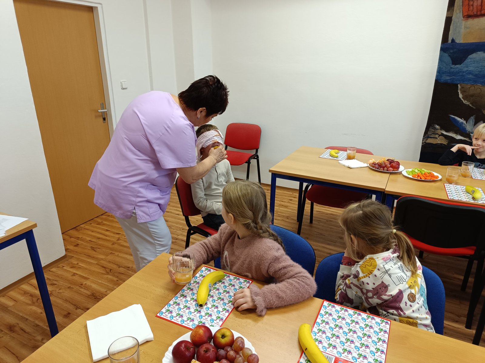 Naplánovali jsme pro ně „Vitamínový den“. Naše skvělé paní kuchařky ze školní jídelny si daly velmi záležet na její přípravě. Jen si to představte – čerstvé, voňavé ovoce nachystané na tácech a čeká jen na vás. Během ochutnávky se děti dozvěděly nejrůznější zajímavosti o vitamínech, nejen o „céčku“, tedy vitamínu C, ale i o dalších, které nás udržují silné a zdravé. Zjistily, které vitamíny se nachází v různých druzích ovoce a zeleniny, a nakonec dostaly i odměnu v podobě vitamínového pexesa a ovoce.